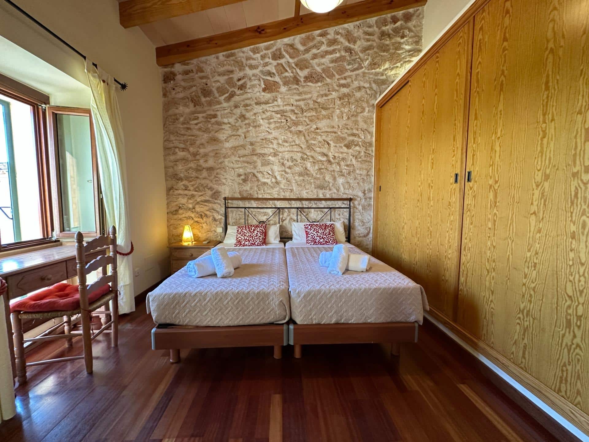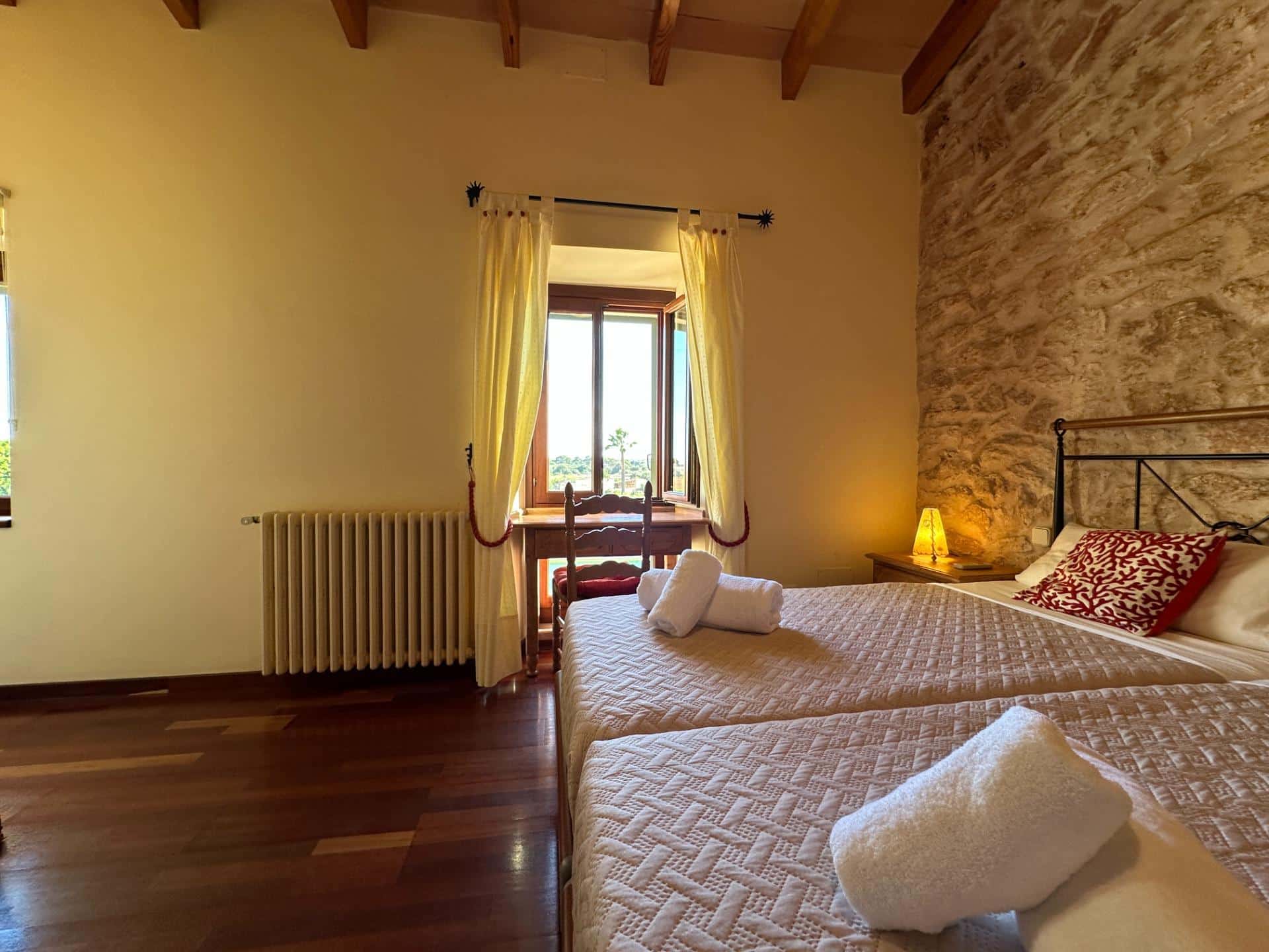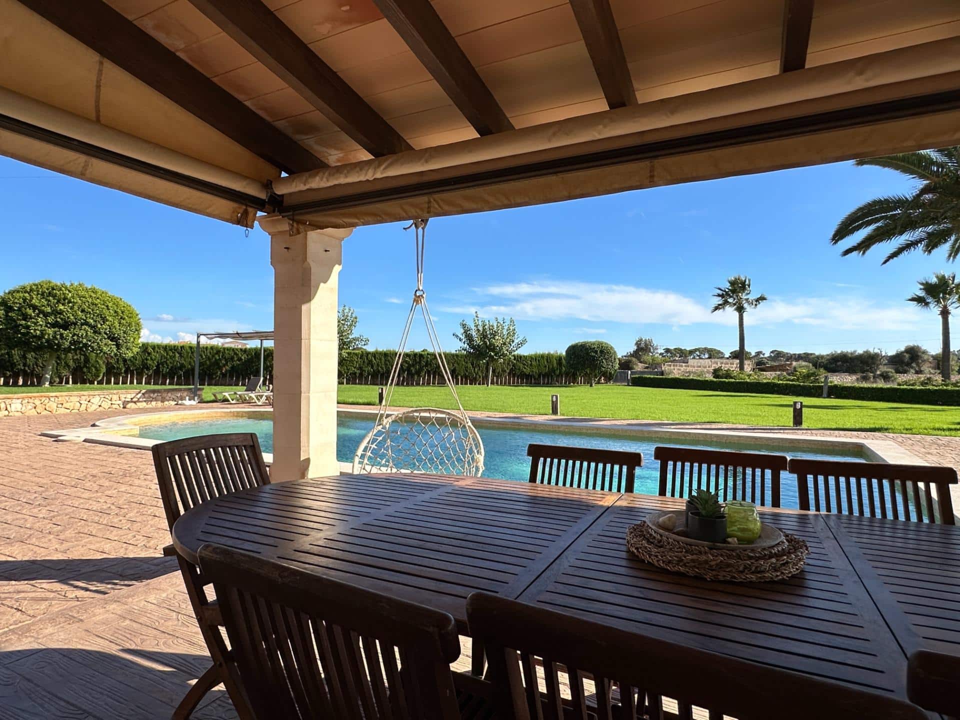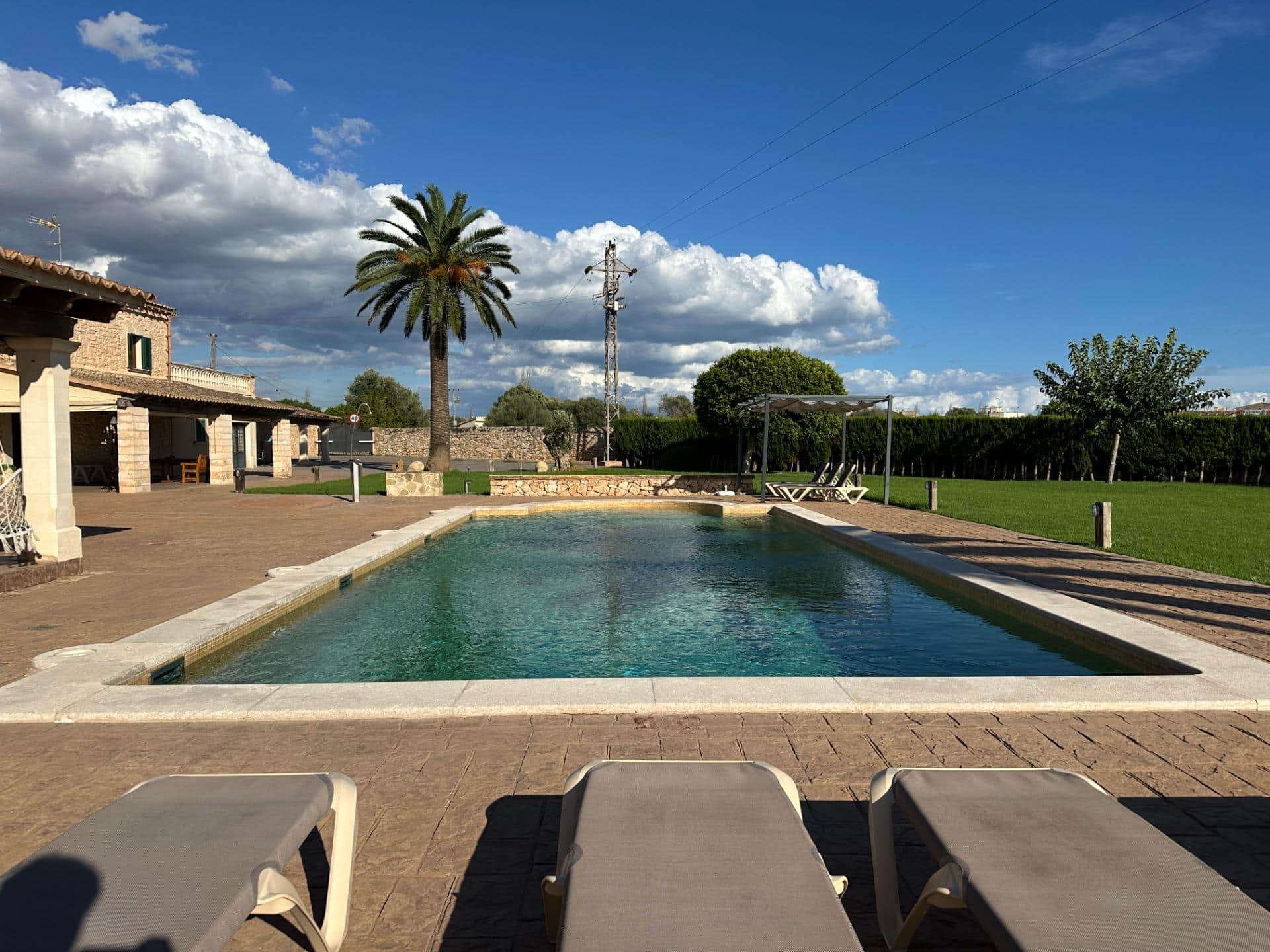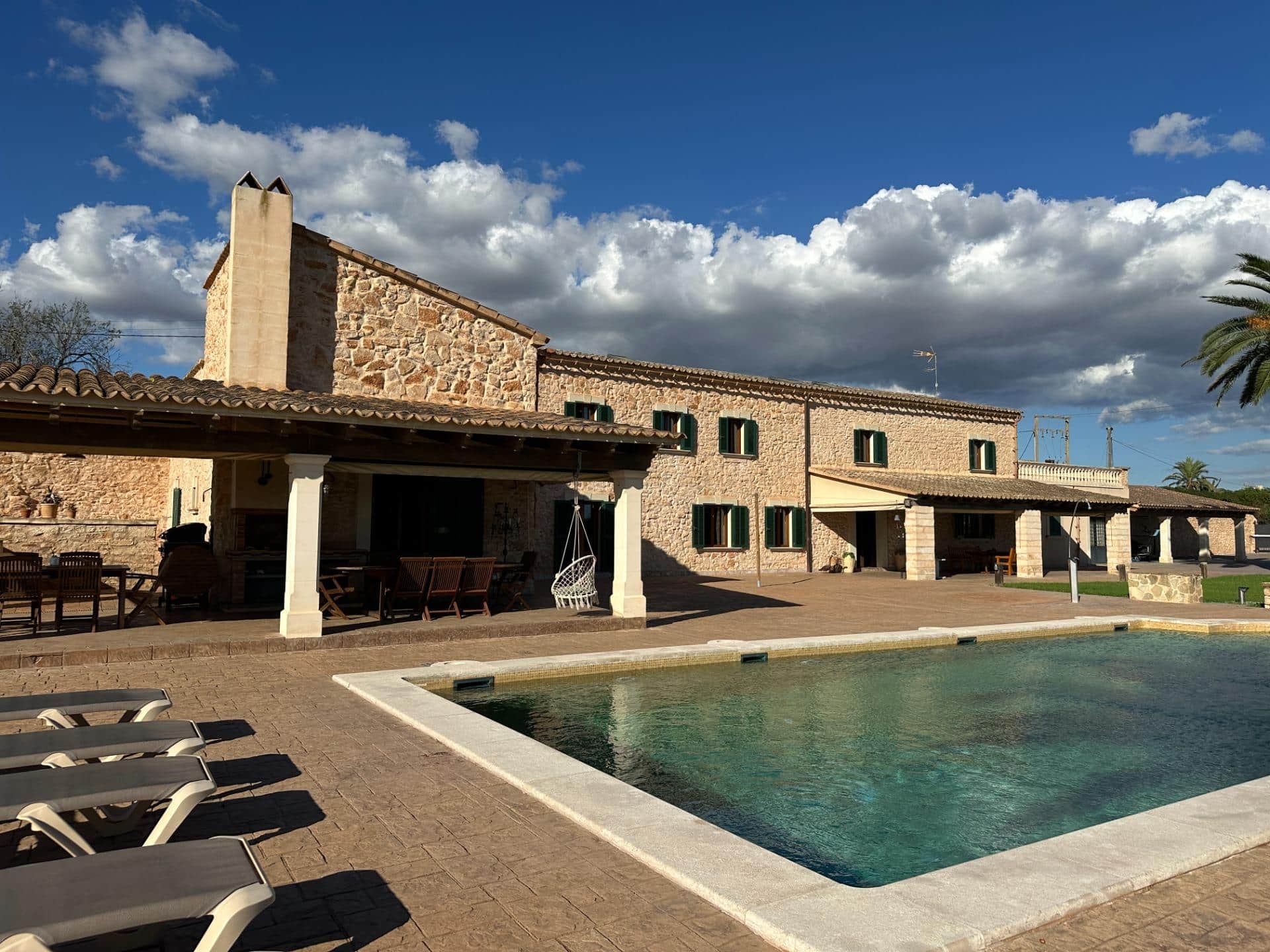 Casa de camp amb caràcter, d’estil mallorquí a 8 minuts caminant del centre de Santanyí amb llicència de lloguer turístic de 8 places.~~Santanyí; en els darrers anys, la seva popularitat i merescuda fama han anat creixent, convertint-se en un dels pobles més visitats de l’illa. Famosa pels seus 2 mercats setmanals, la seva arquitectura tradicional i els seus esdeveniments culturals. A més, compta amb una línia de costa amb unes platges paradisíaques de sorra blanca i aigua transparent.~~La casa és d’arquitectura tradicional mallorquina, està situada als afores del poble en un terreny de 26.618 m². Consta d’una habitatge unifamiliar aïllat amb piscina, amb una superfície en dues plantes de 517 m², piscina de 82 m² de mirall d’aigua, 520 m² de terrasses. Parets interiors i exteriors de pedra. La cuina i la sala menjador es troben a la planta baixa, disposa d’1 habitació doble amb bany a la planta baixa i tres habitacions dobles, una amb bany en suite i les altres dues amb bany compartit, a la primera planta. A la planta baixa també té un bany extra per a convidats.~~Porxos 161 m². Zona jardí amb 1.800 m² de gespa. Sala de màquines subterrània 55 m². Reformada íntegrament l’any 2000, té una llicència per a una ampliació d’uns 150 m². Connexió elèctrica. Pou d’aigua dolça legalitzat. 1 aljub de gran capacitat per a reg jardí. 1 aljub per a emmagatzematge aigua llar. Calefacció central (radiadors) Gasoil. Piscina per hidròlisi de sal.~