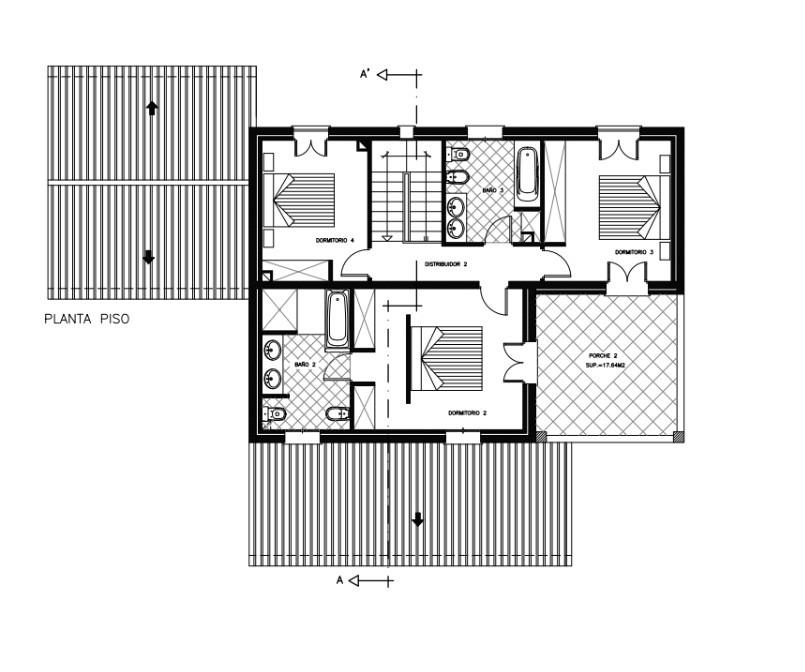 Distribució : 4 dormitoris (1 en planta baixa, 3 en planta primera) i 4 banys en total.