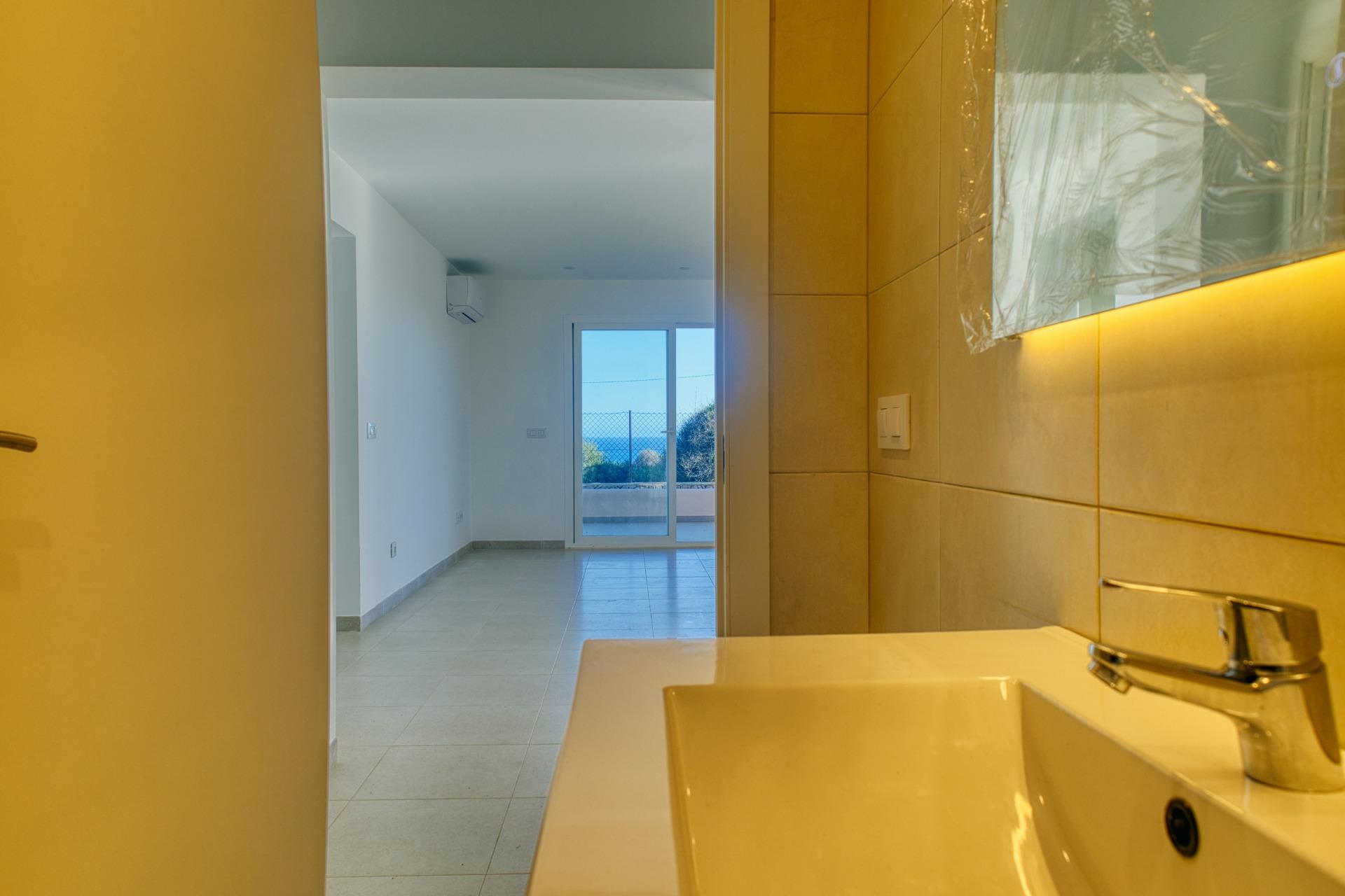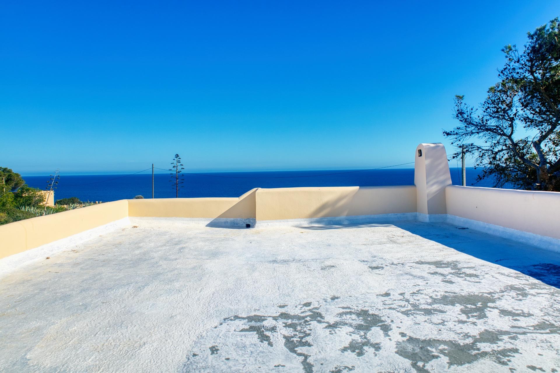 Das funktional aufgeteilte Haus verfügt über drei Doppelzimmer, jeweils mit Einbauschränken und Klimaanlage. Es bietet außerdem ein Badezimmer, eine voll ausgestattete Küche und ein Wohn-Esszimmer mit Kamin und Panoramafenstern zum Meer, die einen unverbauten Ausblick und viel Tageslicht bieten.