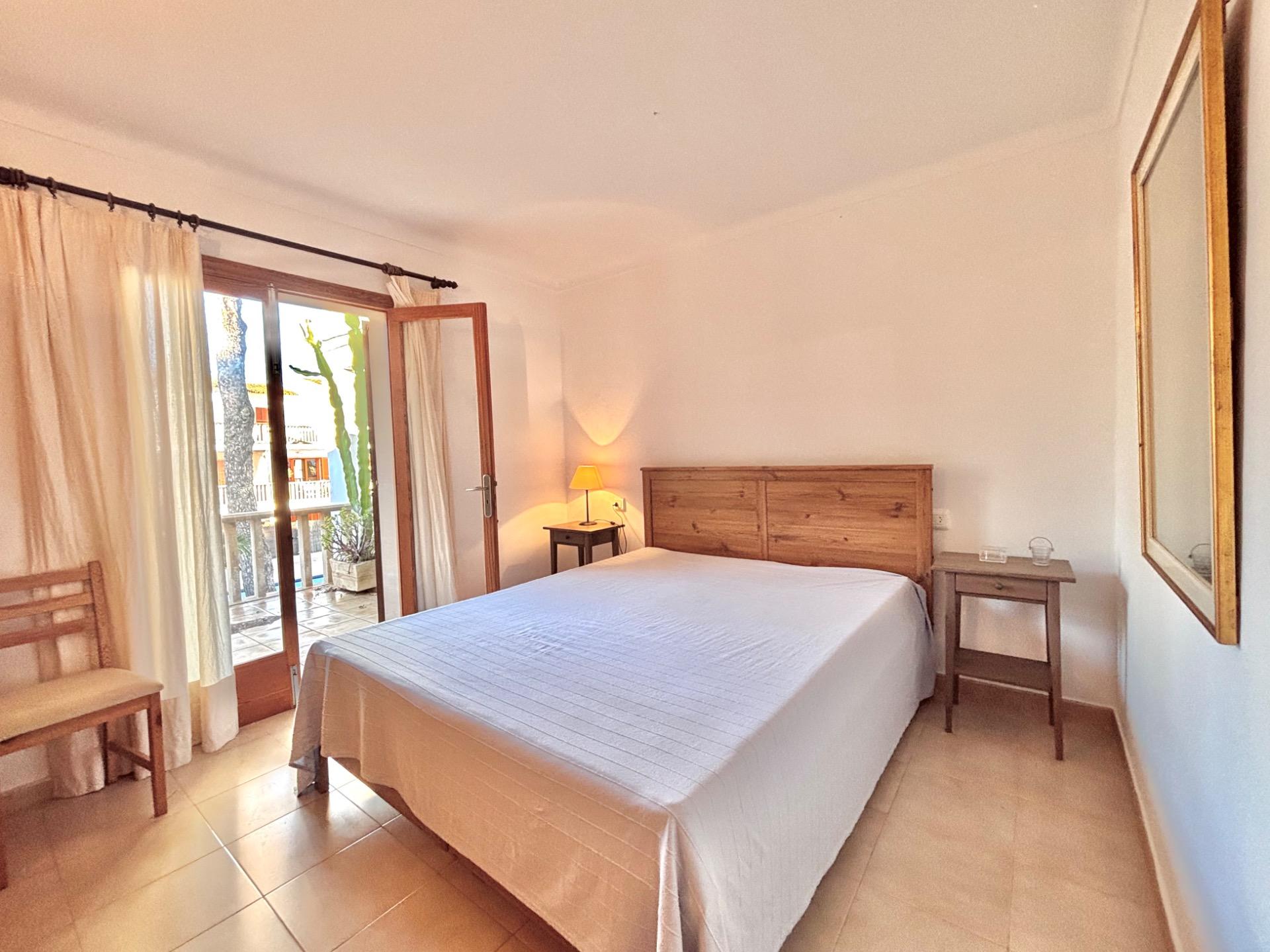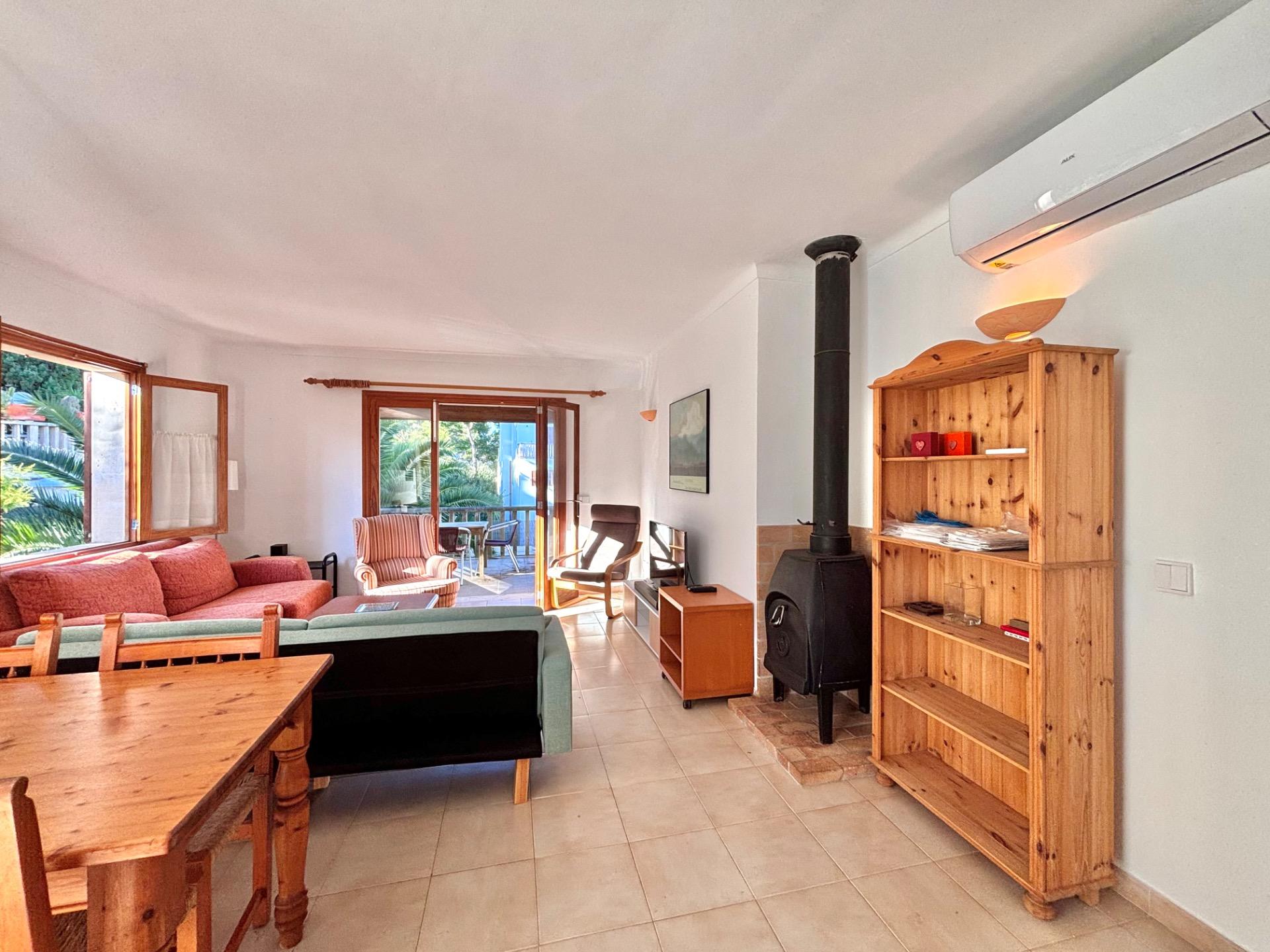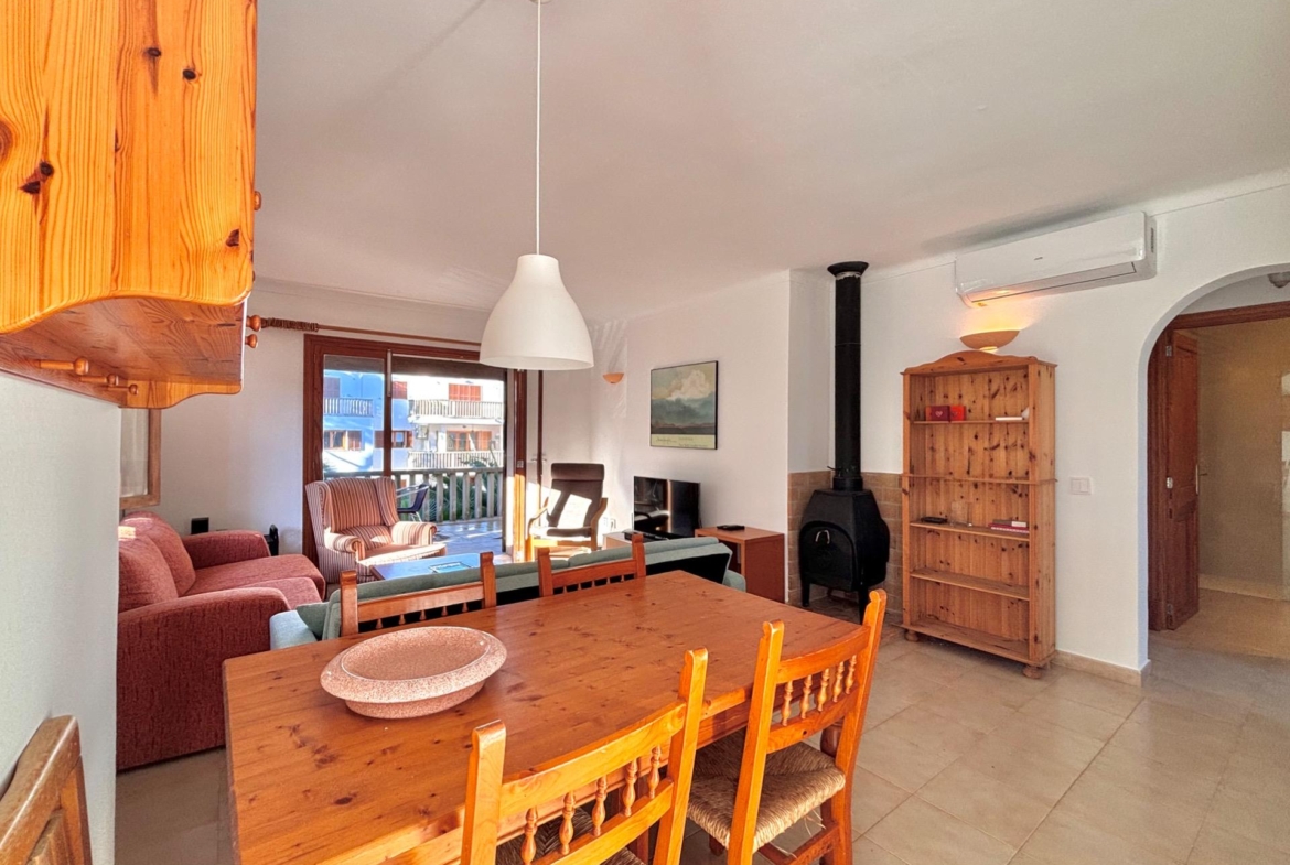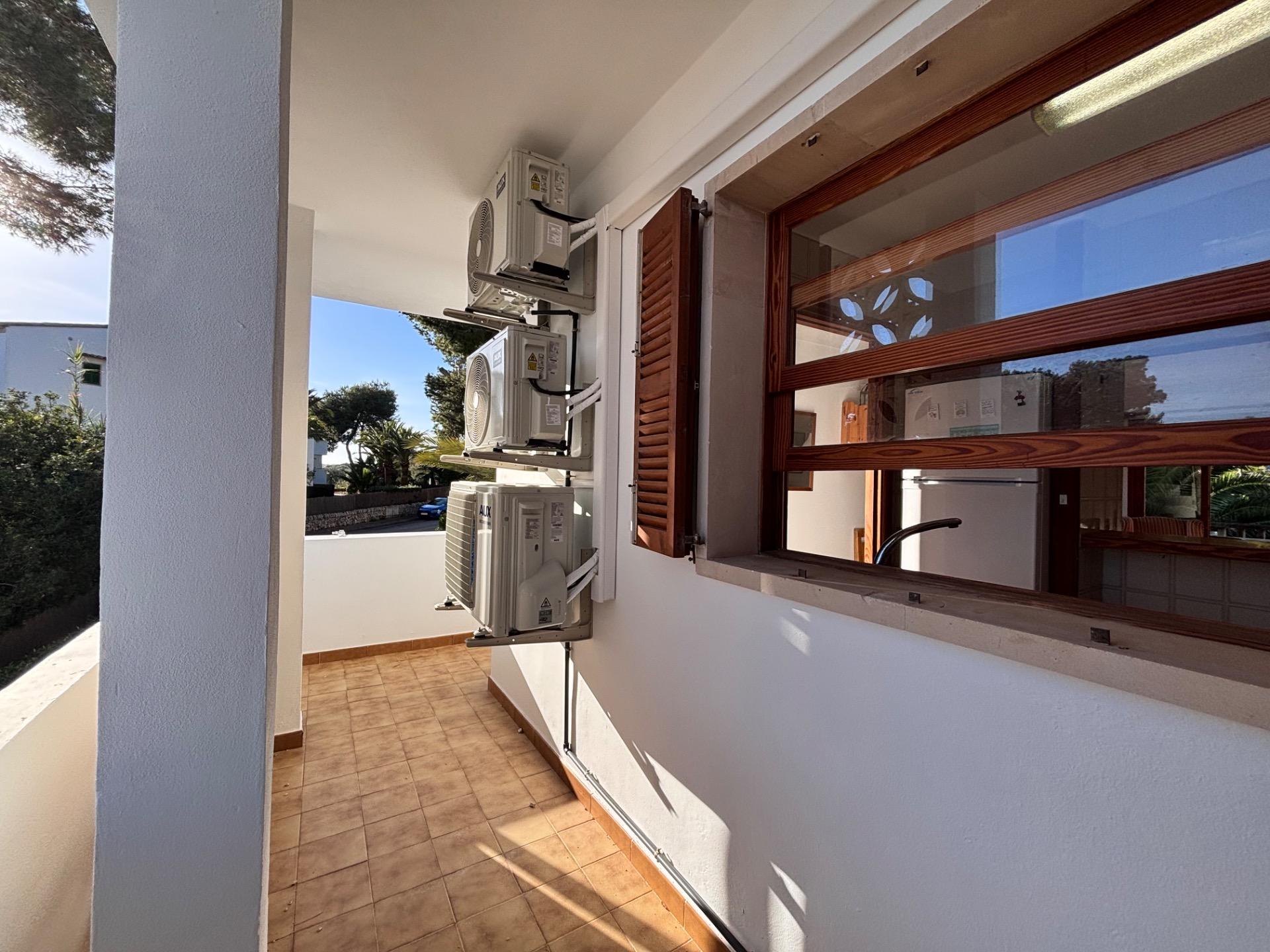 Die möblierte Wohnung befindet sich im ersten Stock einer Wohnanlage mit mehreren Apartments, die sich einen Gemeinschaftspool teilen.~Sie verfügt über eine kleine offene Küche, die in den hellen Wohn- und Essbereich mit Kamin übergeht und direkten Zugang zu einer großen Terrasse mit Blick auf den Pool bietet. Die Wohnung hat zwei Schlafzimmer und ein Badezimmer mit Dusche.~Die Waschmaschine und der elektrische Warmwasserboiler befinden sich in einem separaten Außenbereich. Kürzlich wurde in allen Räumen eine Klimaanlage installiert.~Der schöne Strand Cala Santanyí ist in wenigen Schritten erreichbar, einfach die Straße hinunter.~