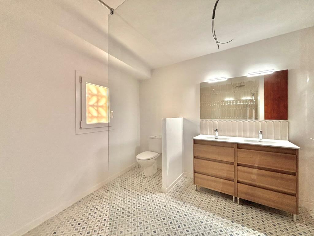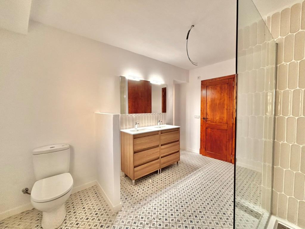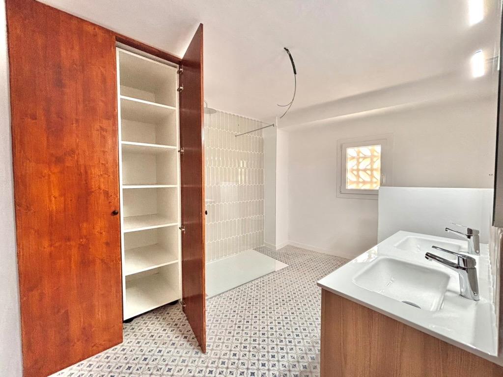 It offers two bedrooms: one facing the street and one overlooking the patio, the latter with a built-in wardrobe. The brand-new bathroom includes a large walk-in shower, double washbasins, and a cupboard housing the water heater with space for towels.