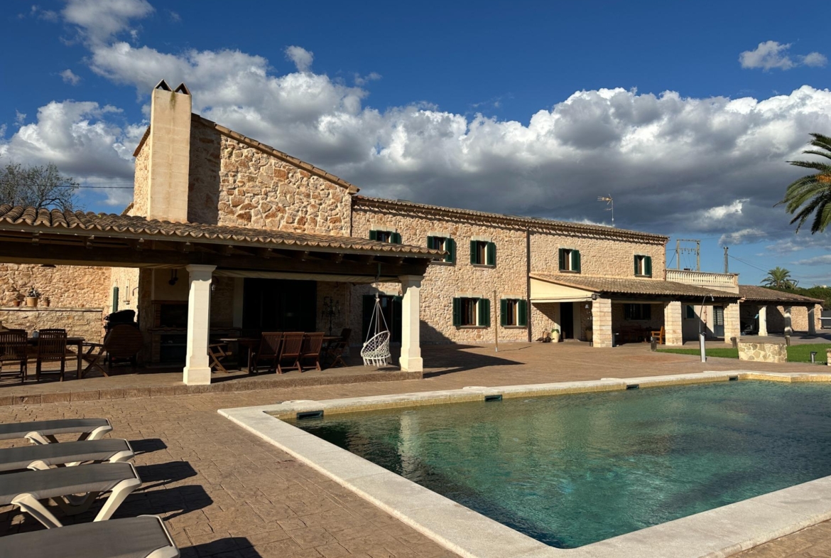 Charming Mallorcan-Style Country House, an 8-minute walk from Santanyí centre, with a tourist rental license for 8 guests.~~Santanyí: in recent years, its deserved popularity and fame have grown, making it one of the most visited towns on the island. Famous for its two weekly markets, traditional architecture, and cultural events. It also boasts a coastline with stunning, transparent-water, white-sand beaches.~~The house features traditional Mallorcan architecture and is situated on the outskirts of the town on a 26,618 m² plot. It consists of a detached single-family house with a pool, spanning 517 m² across two floors, an 82 m² swimming pool, and 520 m² of terraces. The inner and outer walls are made of stone. The kitchen and dining-living room are located on the ground floor, which also includes 1 double bedroom with a bathroom and an extra guest toilet. The first floor features three double bedrooms: one with an en-suite bathroom, and the other two with a shared bathroom.~~Porches 161 m². Garden area with 1,800 m² of lawn. 55 m² underground machine room. Fully renovated in 2000, it includes a license for an extension of approximately 150 m². Electrical connection. Legalized fresh water well. 1 large-capacity water tank (cistern) for garden irrigation. 1 water tank (cistern) for household water storage. Central heating (radiators) via Diesel.~