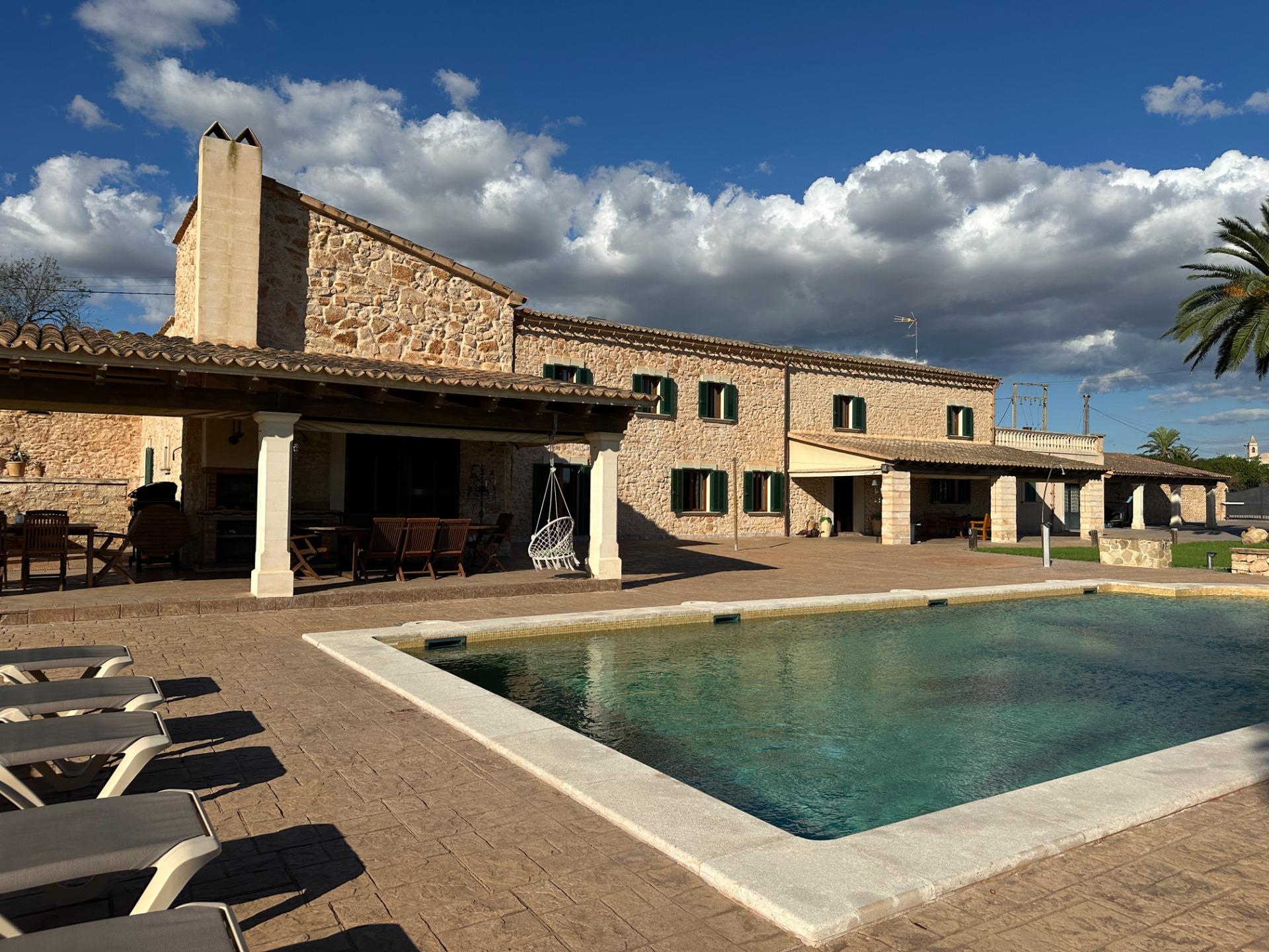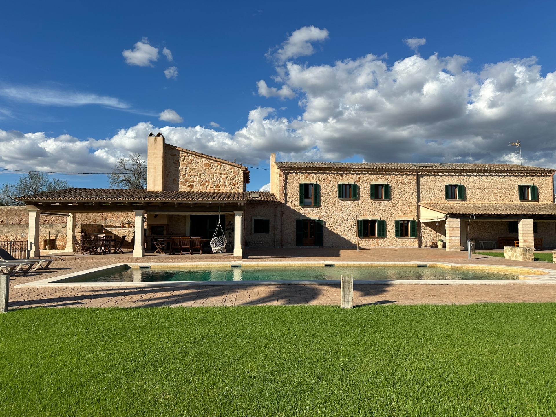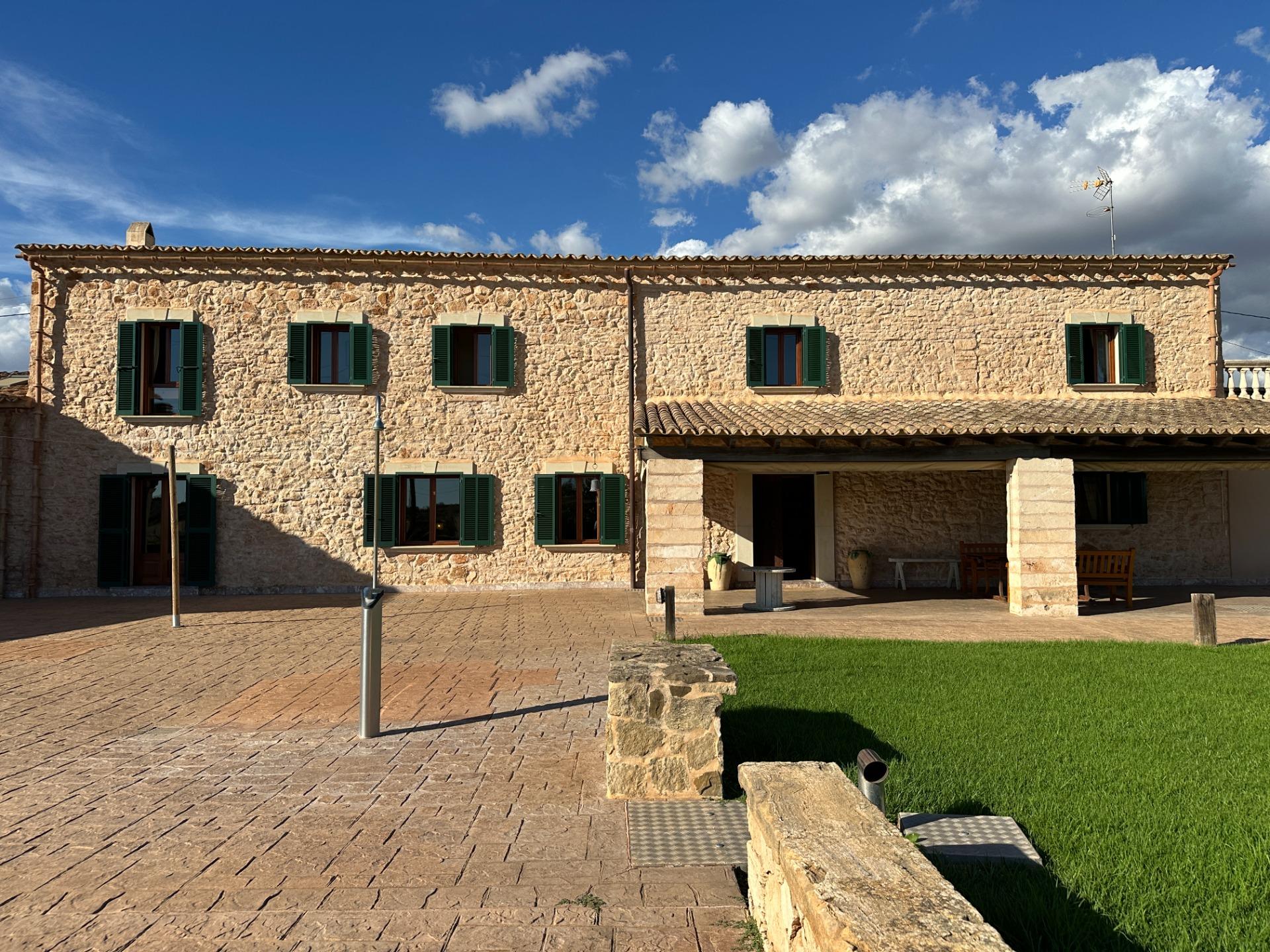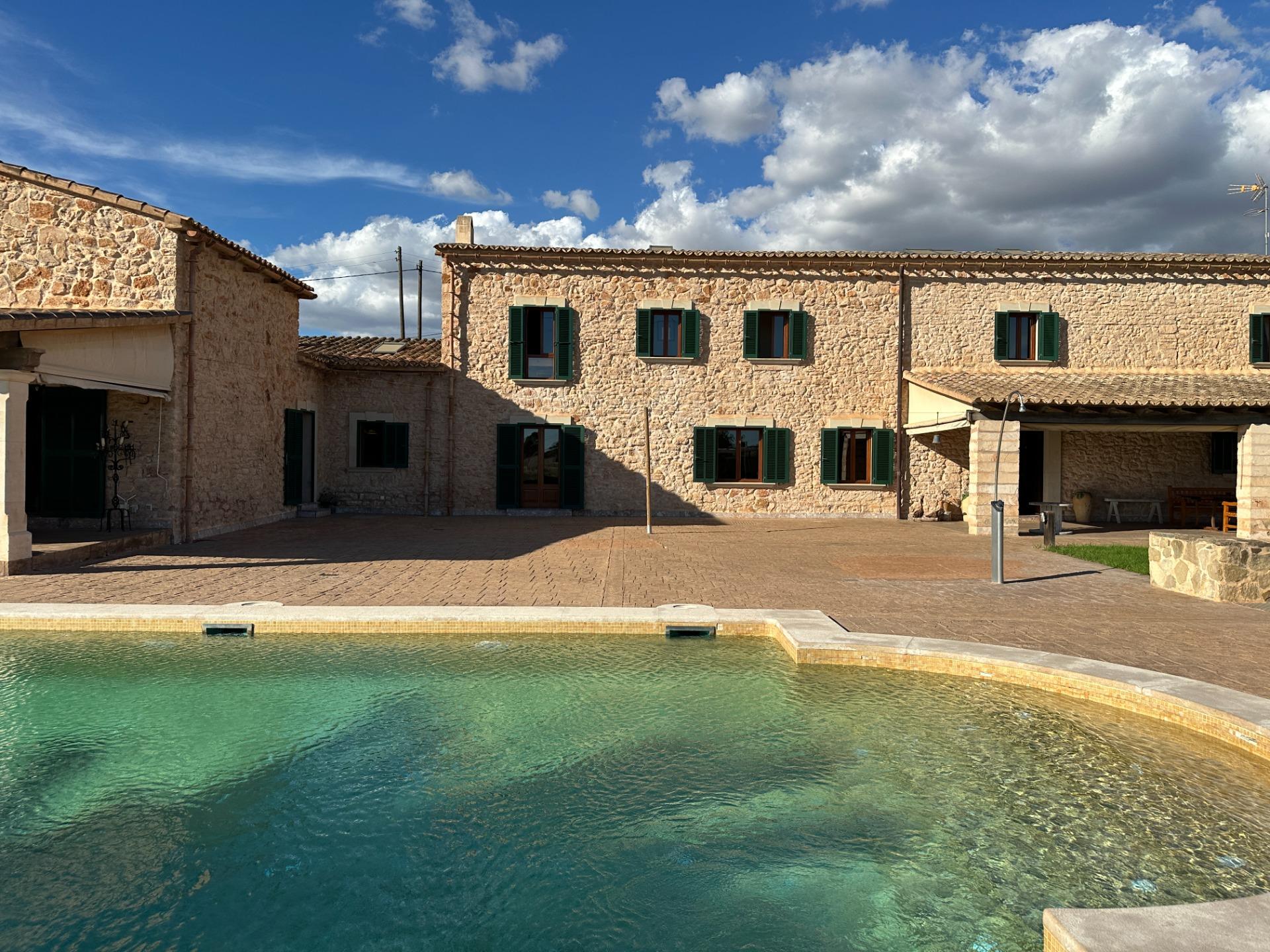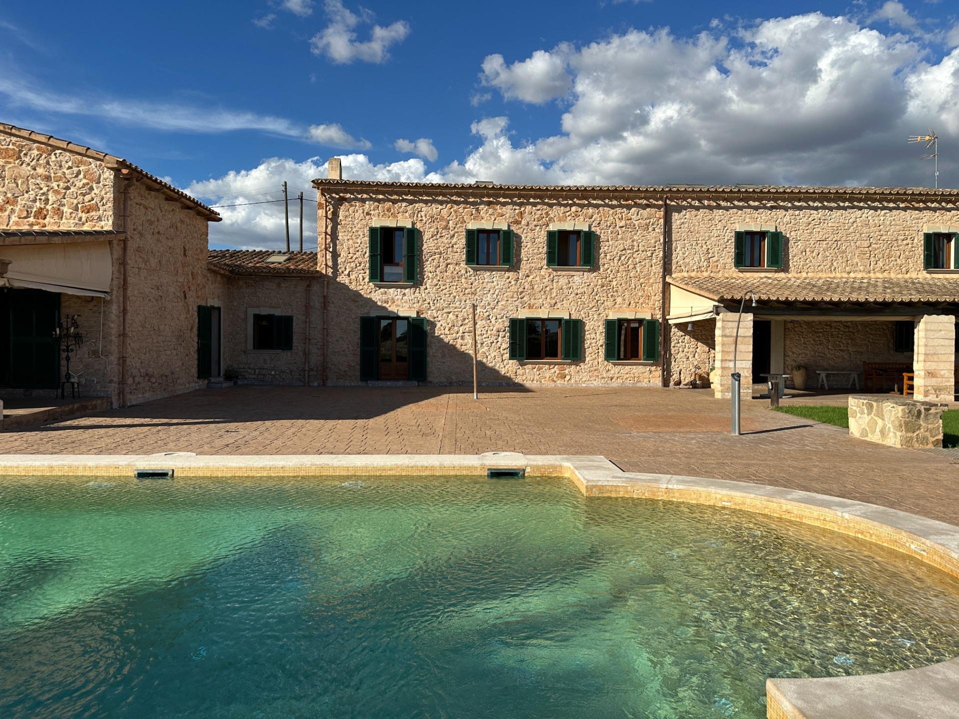 Casa de campo con carácter, de estilo mallorquín a 8 minutos caminando del centro de Santanyí con licencia de alquiler turístico de 8 plazas. Santanyí; en los últimos años, su popularidad y merecida fama han ido creciendo, convirtiéndose en uno de los pueblos más visitados de la isla. Famoso por sus 2 mercados semanales, su arquitectura tradicional y sus eventos culturales. Además cuenta con una línea de costa con unas playas paradisíacas de arena blanca y agua transparente.La casa es de arquitectura tradicional mallorquina, está situada en las afueras del pueblo en un terreno de 26.618 m2. Consta de una vivienda unifamiliar aislada con piscina, con una superficie en dos plantas de 517m2, piscina de 82 m2 de espejo de agua, 520 m2 de terrazas. Paredes interiores y exteriores de piedra. La cocina y el salón comedor se encuentran en la planta baja, dispone de 1 habitación doble con baño en la planta baja y tres habitaciones dobles, una con baño en suite y las otras dos con baño compartido ,en la primera planta. En la planta baja también tiene un baño extra para invitados.Porches 161 m2Zona jardín con 1.800 m2 de césped.Sala de máquinas subterránea 55 m2. Reformada íntegramente en el año 2.000, tiene una licencia para una ampliación de unos 150 m2.Conexión eléctrica. Pozo de agua dulce legalizado.1 aljibe de gran capacidad para riego jardín. 1 aljibe para almacenamiento agua hogar. Calefacción central (radiadores) Gasoil.Piscina por hidrolisis de sal.