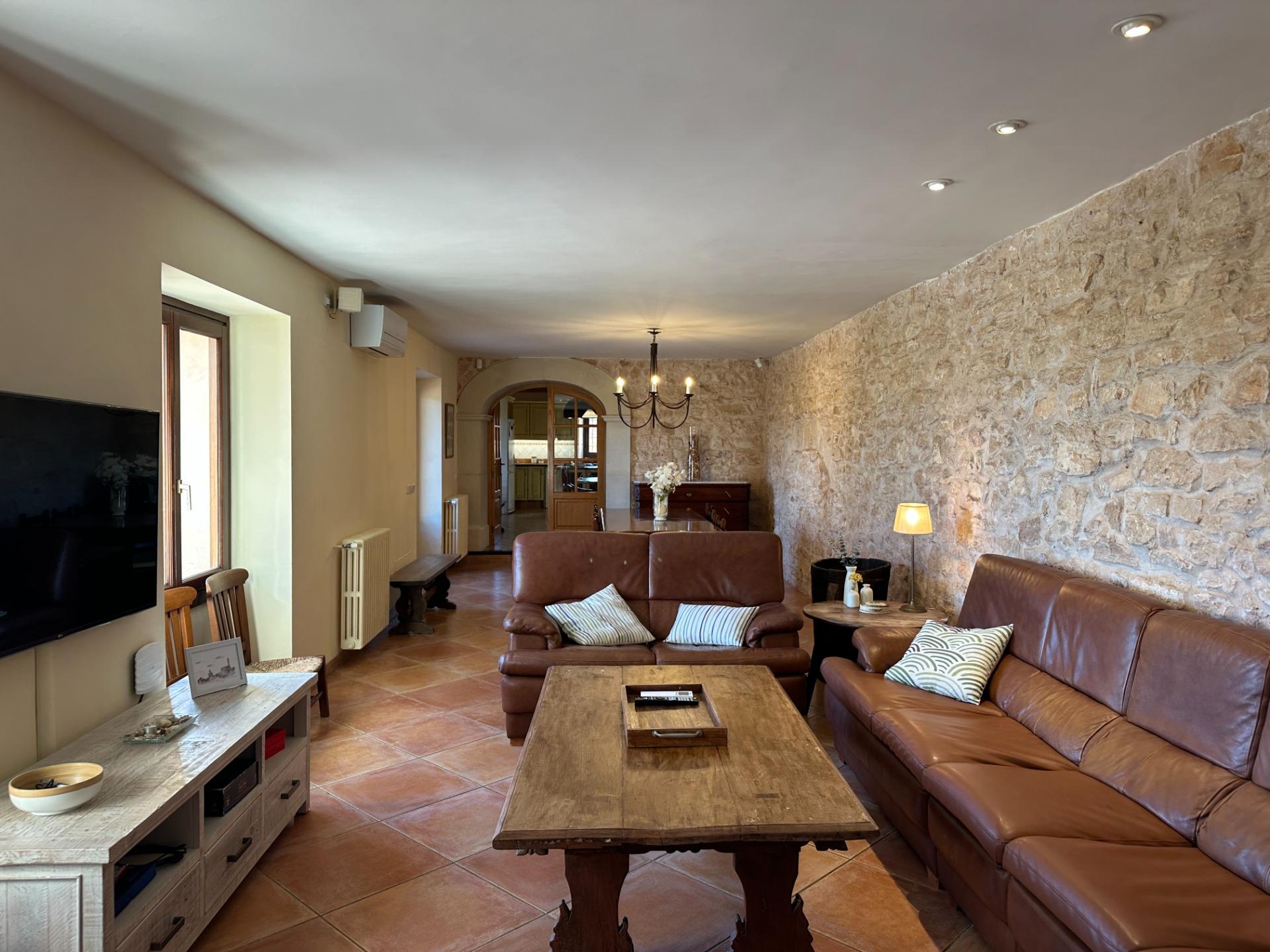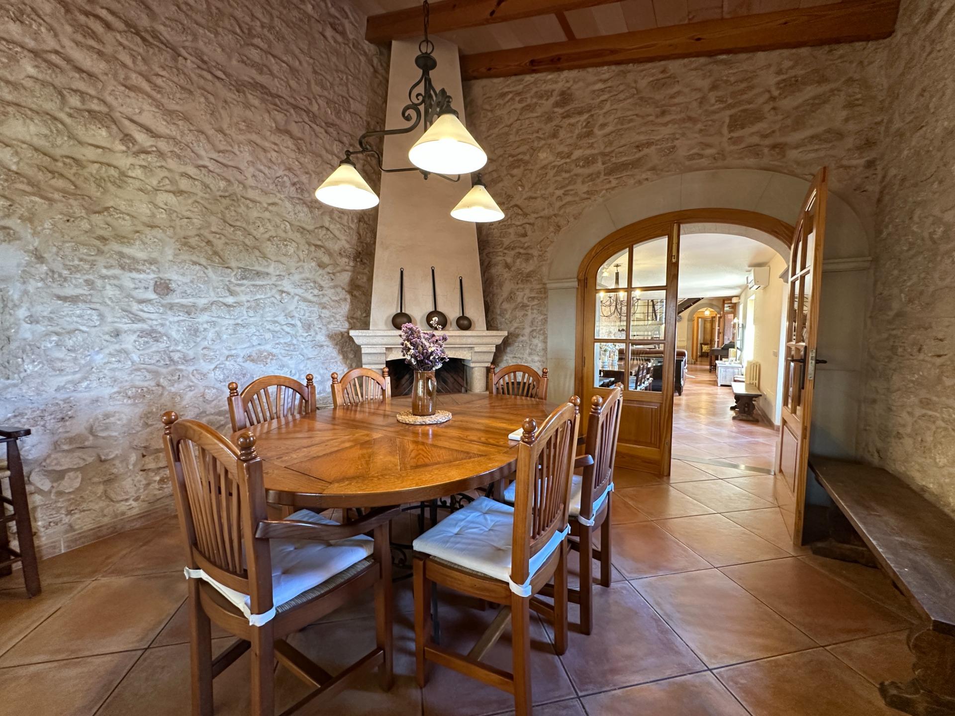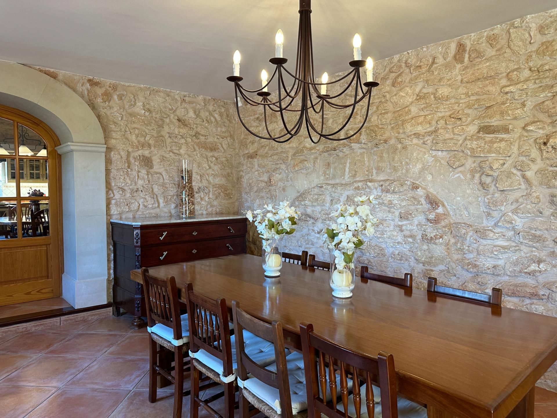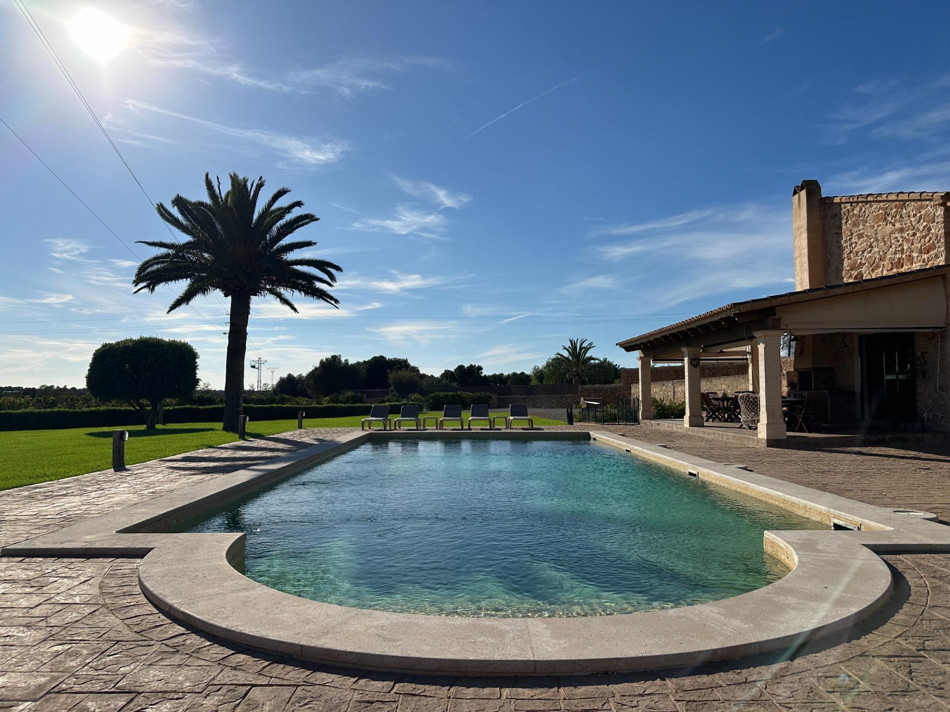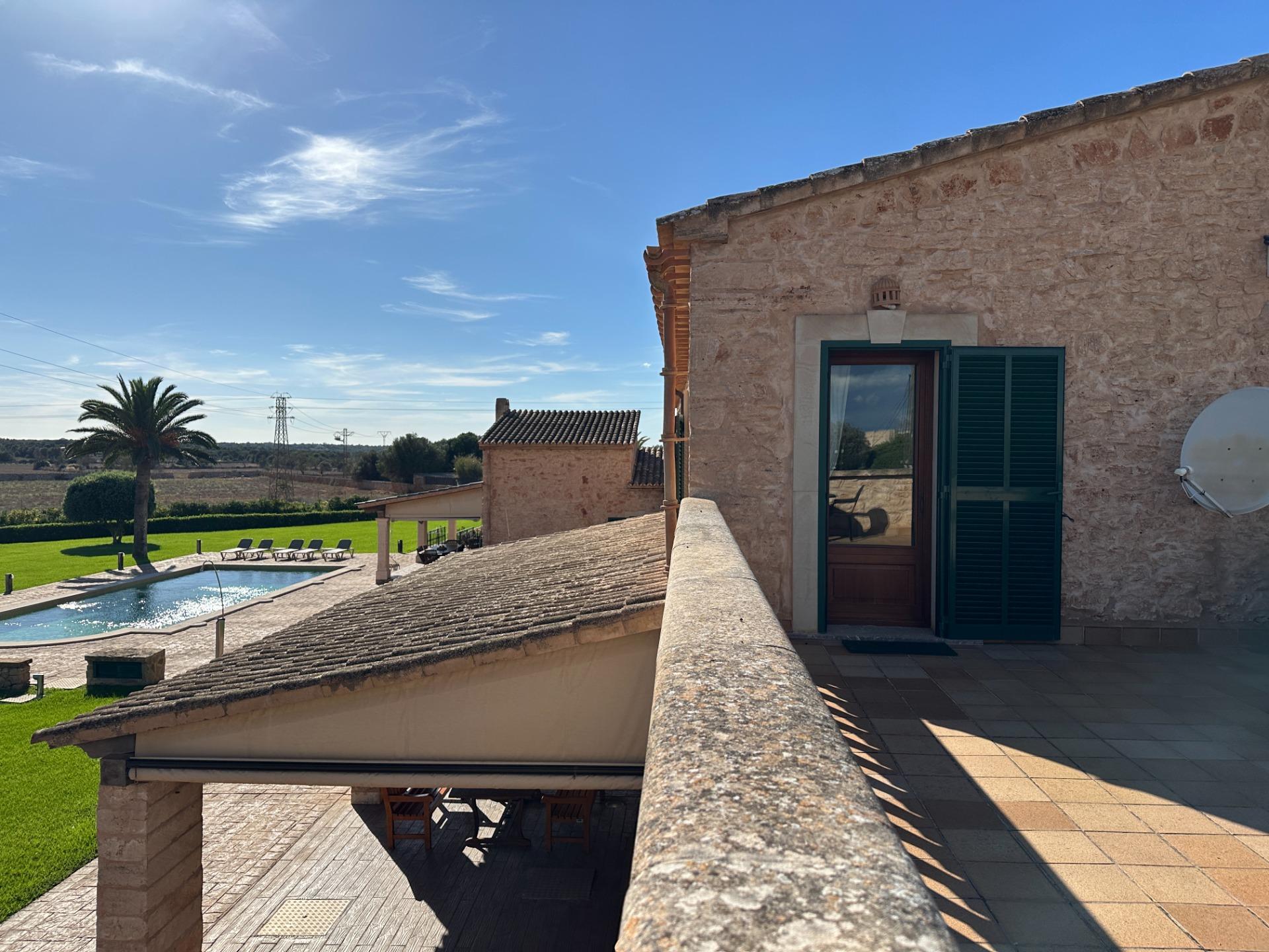 Casa de campo con carácter, de estilo mallorquín a 8 minutos caminando del centro de Santanyí con licencia de alquiler turístico de 8 plazas. Santanyí; en los últimos años, su popularidad y merecida fama han ido creciendo, convirtiéndose en uno de los pueblos más visitados de la isla. Famoso por sus 2 mercados semanales, su arquitectura tradicional y sus eventos culturales. Además cuenta con una línea de costa con unas playas paradisíacas de arena blanca y agua transparente.La casa es de arquitectura tradicional mallorquina, está situada en las afueras del pueblo en un terreno de 26.618 m2. Consta de una vivienda unifamiliar aislada con piscina, con una superficie en dos plantas de 517m2, piscina de 82 m2 de espejo de agua, 520 m2 de terrazas. Paredes interiores y exteriores de piedra. La cocina y el salón comedor se encuentran en la planta baja, dispone de 1 habitación doble con baño en la planta baja y tres habitaciones dobles, una con baño en suite y las otras dos con baño compartido ,en la primera planta. En la planta baja también tiene un baño extra para invitados.Porches 161 m2Zona jardín con 1.800 m2 de césped.Sala de máquinas subterránea 55 m2. Reformada íntegramente en el año 2.000, tiene una licencia para una ampliación de unos 150 m2.Conexión eléctrica. Pozo de agua dulce legalizado.1 aljibe de gran capacidad para riego jardín. 1 aljibe para almacenamiento agua hogar. Calefacción central (radiadores) Gasoil.Piscina por hidrolisis de sal.