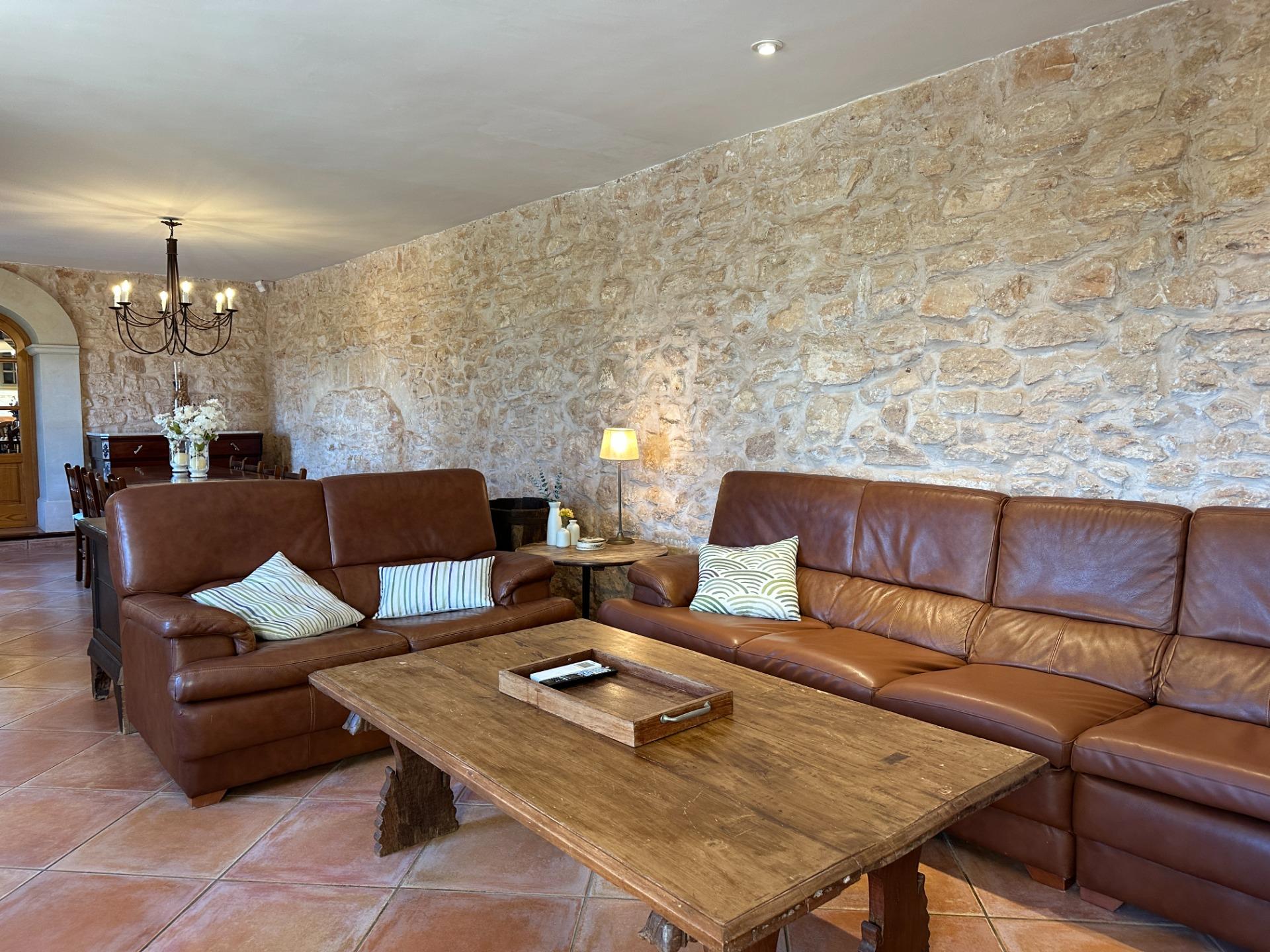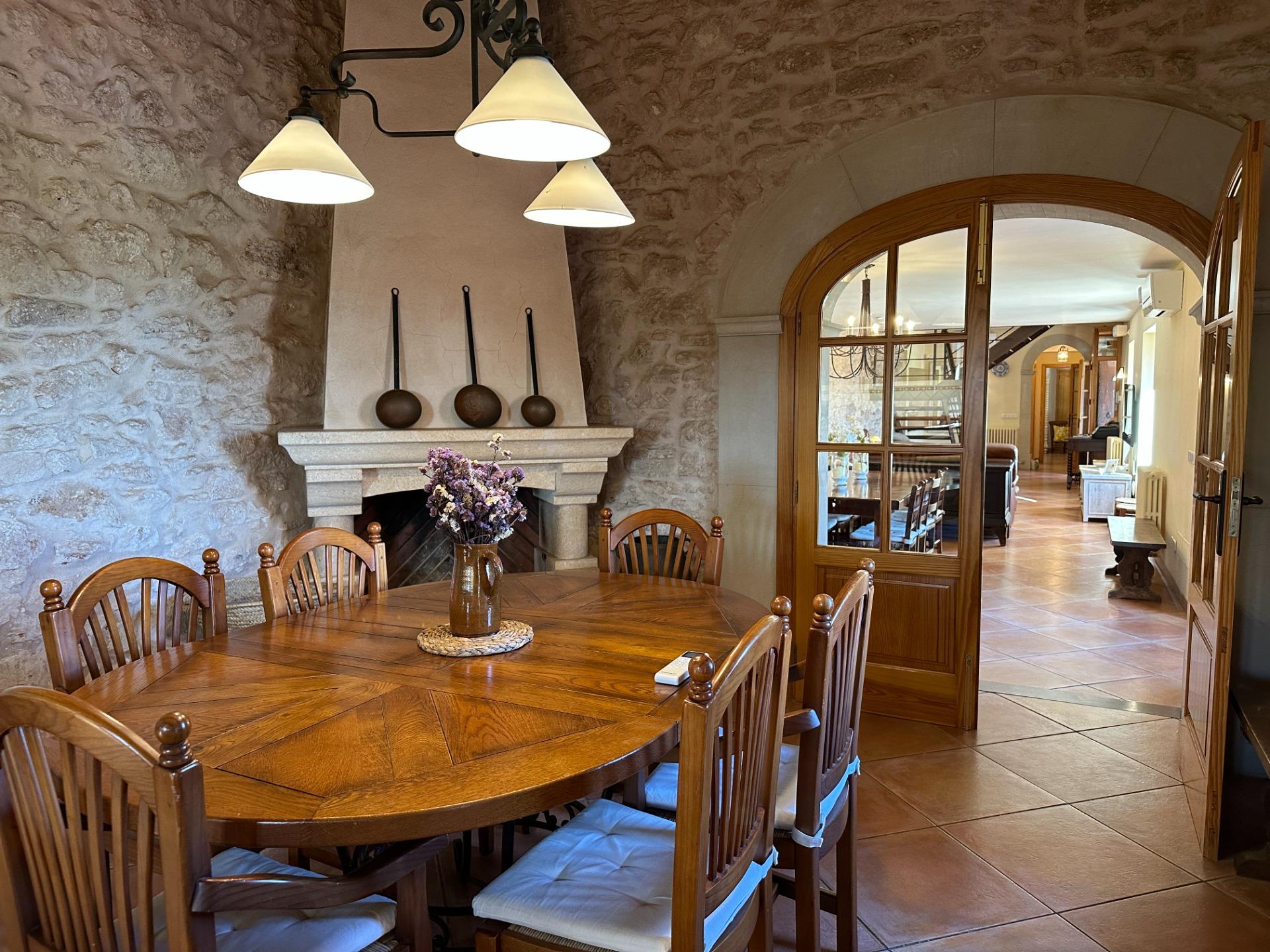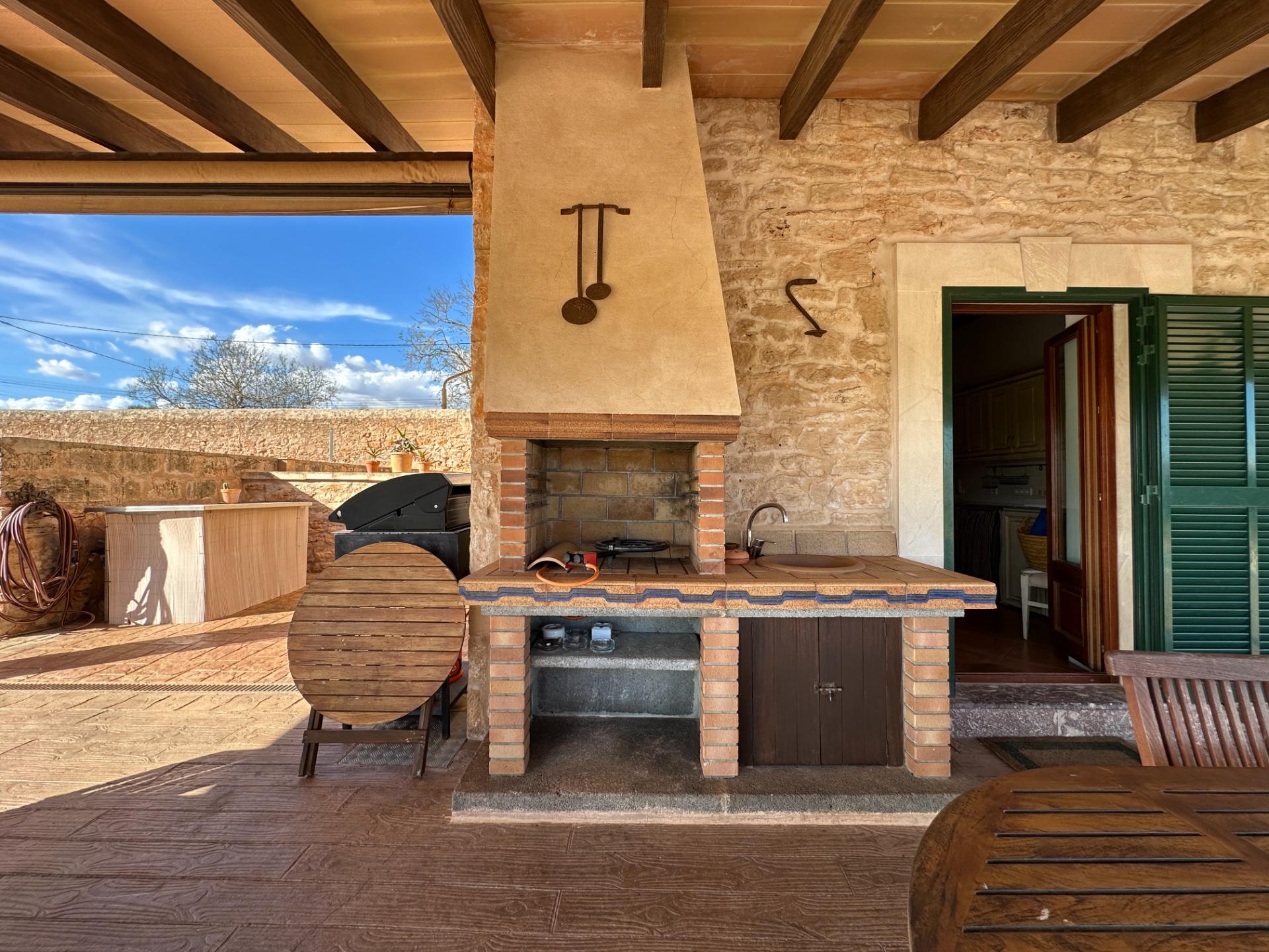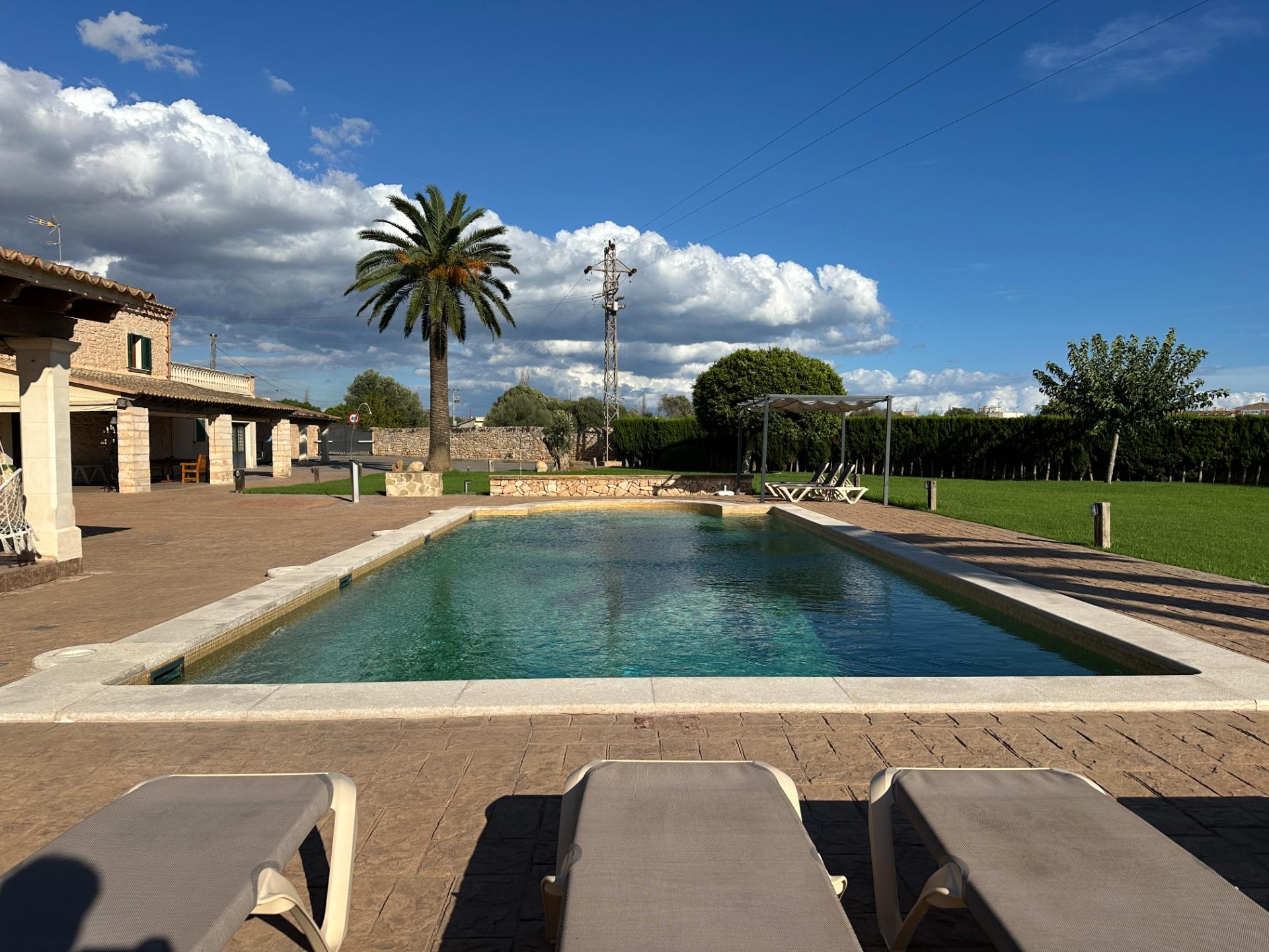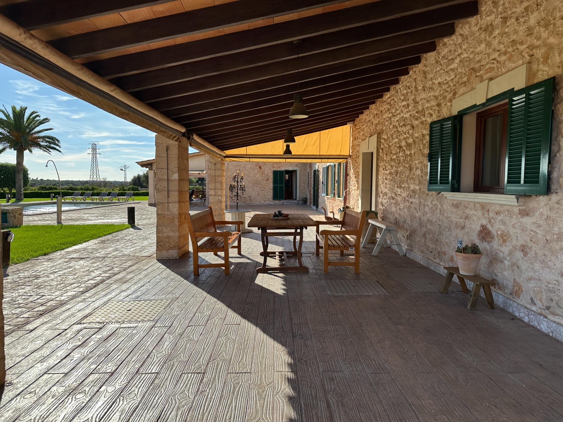 Casa de campo con carácter, de estilo mallorquín a 8 minutos caminando del centro de Santanyí con licencia de alquiler turístico de 8 plazas. Santanyí; en los últimos años, su popularidad y merecida fama han ido creciendo, convirtiéndose en uno de los pueblos más visitados de la isla. Famoso por sus 2 mercados semanales, su arquitectura tradicional y sus eventos culturales. Además cuenta con una línea de costa con unas playas paradisíacas de arena blanca y agua transparente.La casa es de arquitectura tradicional mallorquina, está situada en las afueras del pueblo en un terreno de 26.618 m2. Consta de una vivienda unifamiliar aislada con piscina, con una superficie en dos plantas de 517m2, piscina de 82 m2 de espejo de agua, 520 m2 de terrazas. Paredes interiores y exteriores de piedra. La cocina y el salón comedor se encuentran en la planta baja, dispone de 1 habitación doble con baño en la planta baja y tres habitaciones dobles, una con baño en suite y las otras dos con baño compartido ,en la primera planta. En la planta baja también tiene un baño extra para invitados.Porches 161 m2Zona jardín con 1.800 m2 de césped.Sala de máquinas subterránea 55 m2. Reformada íntegramente en el año 2.000, tiene una licencia para una ampliación de unos 150 m2.Conexión eléctrica. Pozo de agua dulce legalizado.1 aljibe de gran capacidad para riego jardín. 1 aljibe para almacenamiento agua hogar. Calefacción central (radiadores) Gasoil.Piscina por hidrolisis de sal.