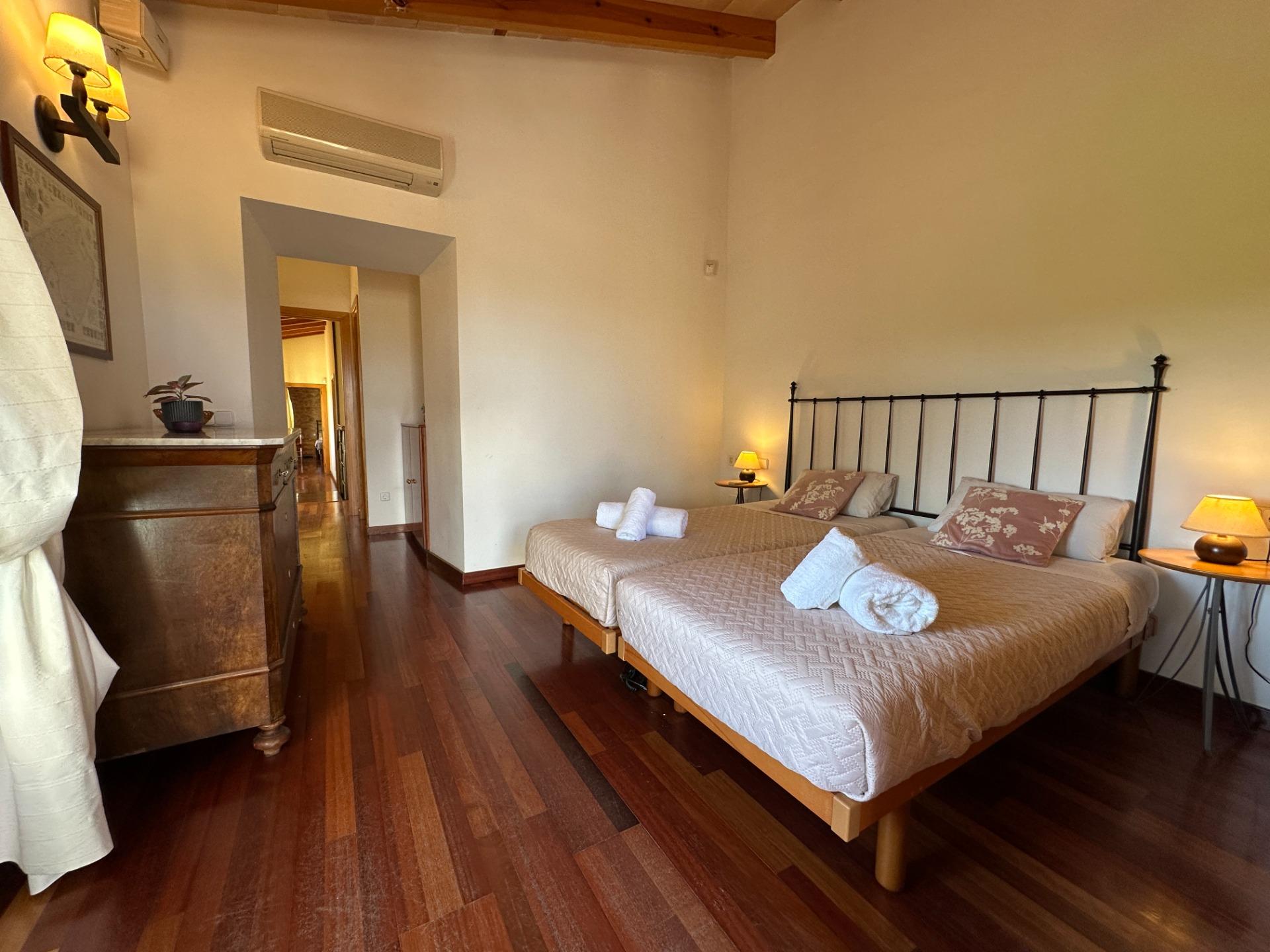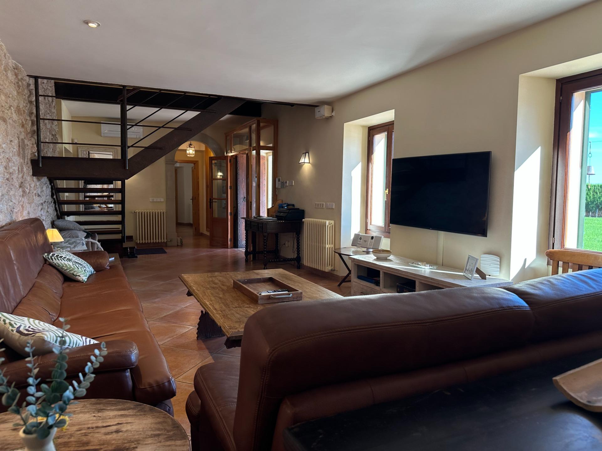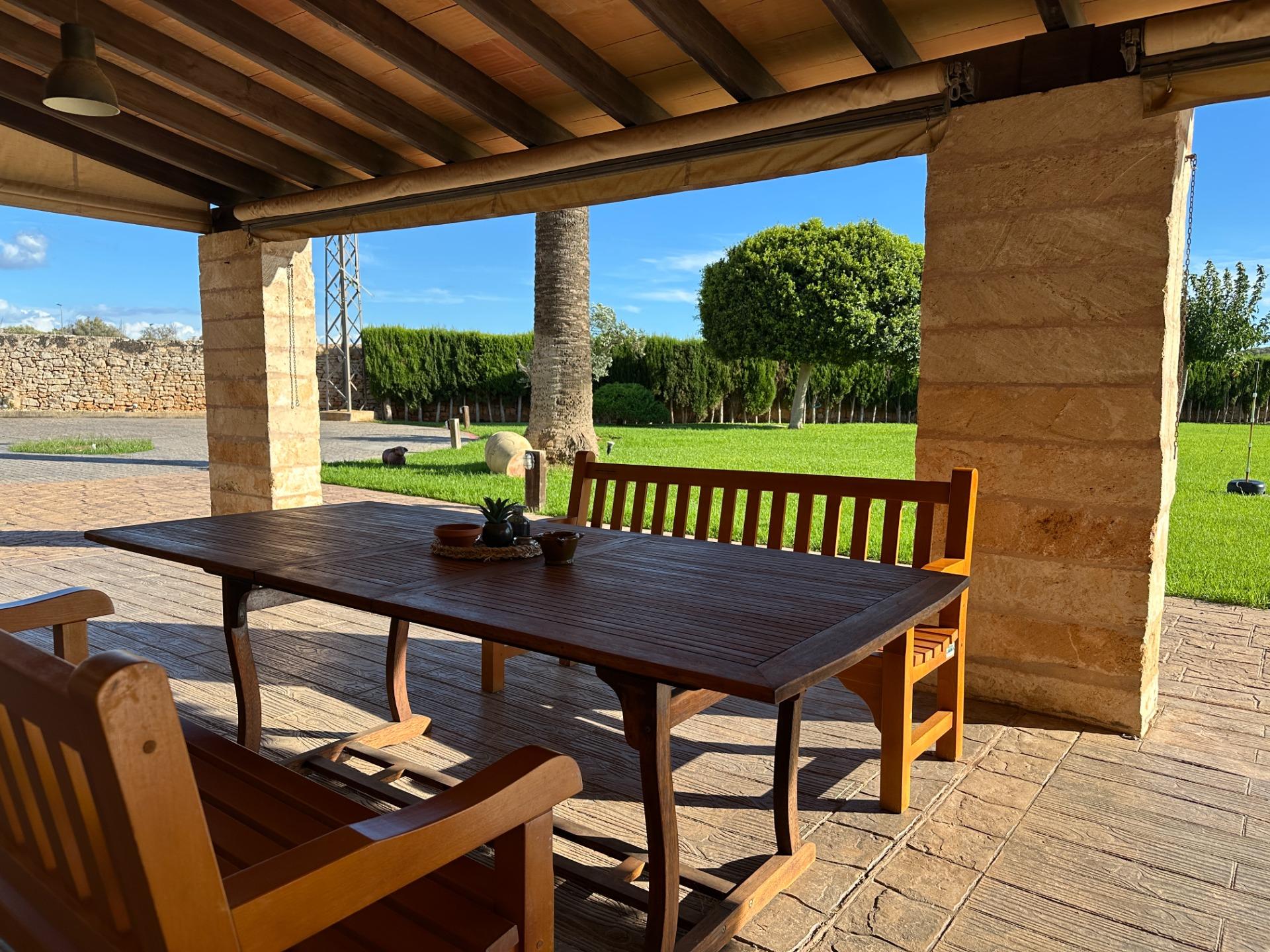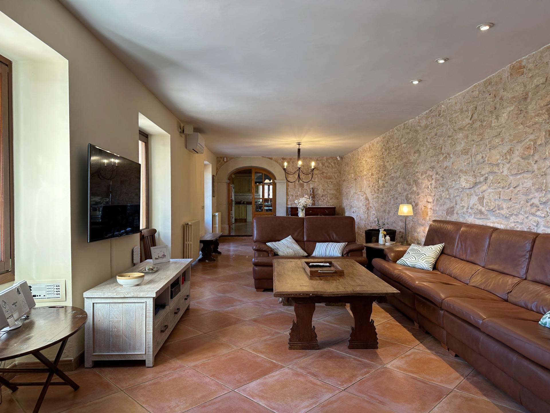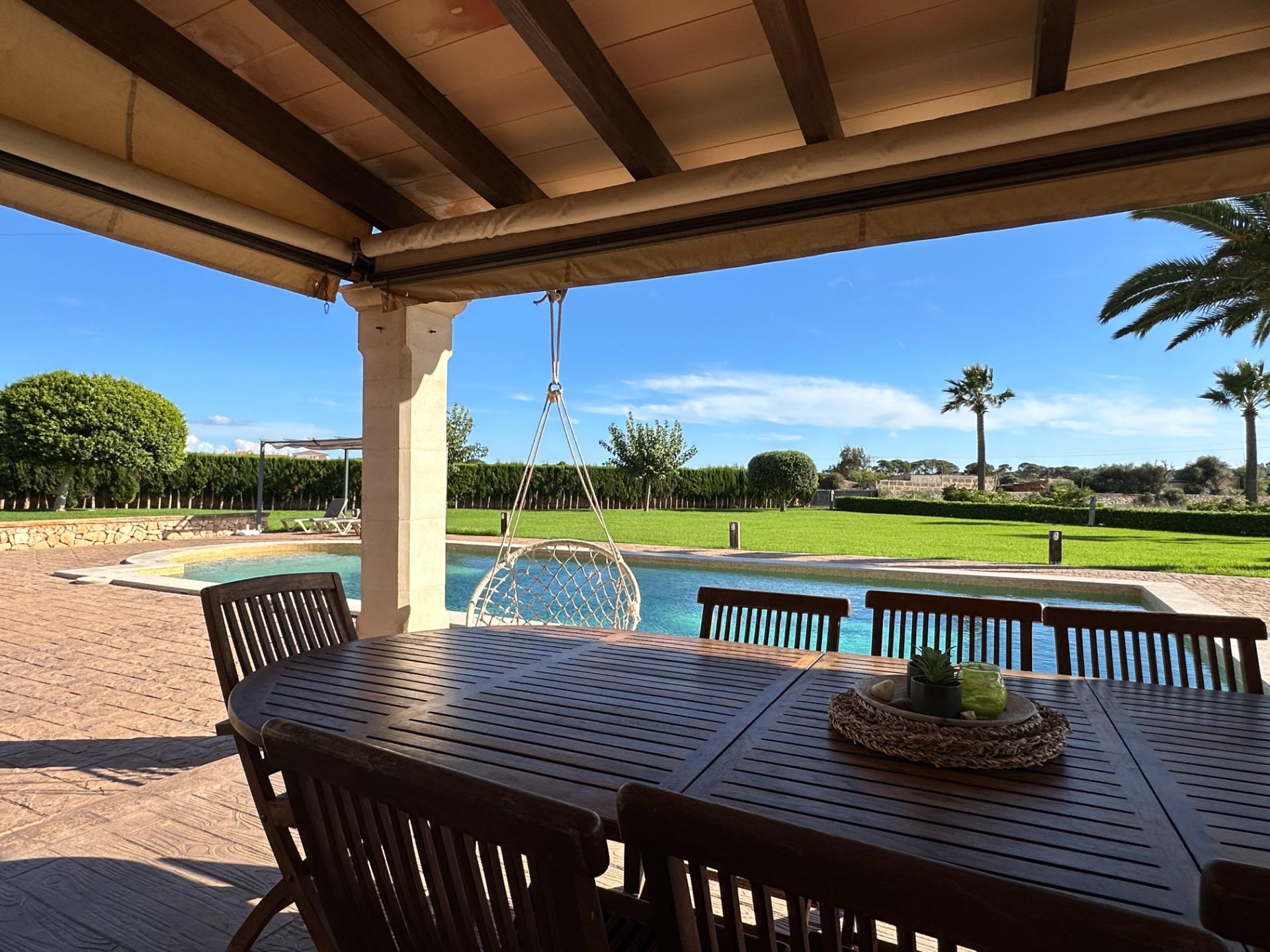 Casa de campo con carácter, de estilo mallorquín a 8 minutos caminando del centro de Santanyí con licencia de alquiler turístico de 8 plazas. Santanyí; en los últimos años, su popularidad y merecida fama han ido creciendo, convirtiéndose en uno de los pueblos más visitados de la isla. Famoso por sus 2 mercados semanales, su arquitectura tradicional y sus eventos culturales. Además cuenta con una línea de costa con unas playas paradisíacas de arena blanca y agua transparente.La casa es de arquitectura tradicional mallorquina, está situada en las afueras del pueblo en un terreno de 26.618 m2. Consta de una vivienda unifamiliar aislada con piscina, con una superficie en dos plantas de 517m2, piscina de 82 m2 de espejo de agua, 520 m2 de terrazas. Paredes interiores y exteriores de piedra. La cocina y el salón comedor se encuentran en la planta baja, dispone de 1 habitación doble con baño en la planta baja y tres habitaciones dobles, una con baño en suite y las otras dos con baño compartido ,en la primera planta. En la planta baja también tiene un baño extra para invitados.Porches 161 m2Zona jardín con 1.800 m2 de césped.Sala de máquinas subterránea 55 m2. Reformada íntegramente en el año 2.000, tiene una licencia para una ampliación de unos 150 m2.Conexión eléctrica. Pozo de agua dulce legalizado.1 aljibe de gran capacidad para riego jardín. 1 aljibe para almacenamiento agua hogar. Calefacción central (radiadores) Gasoil.Piscina por hidrolisis de sal.