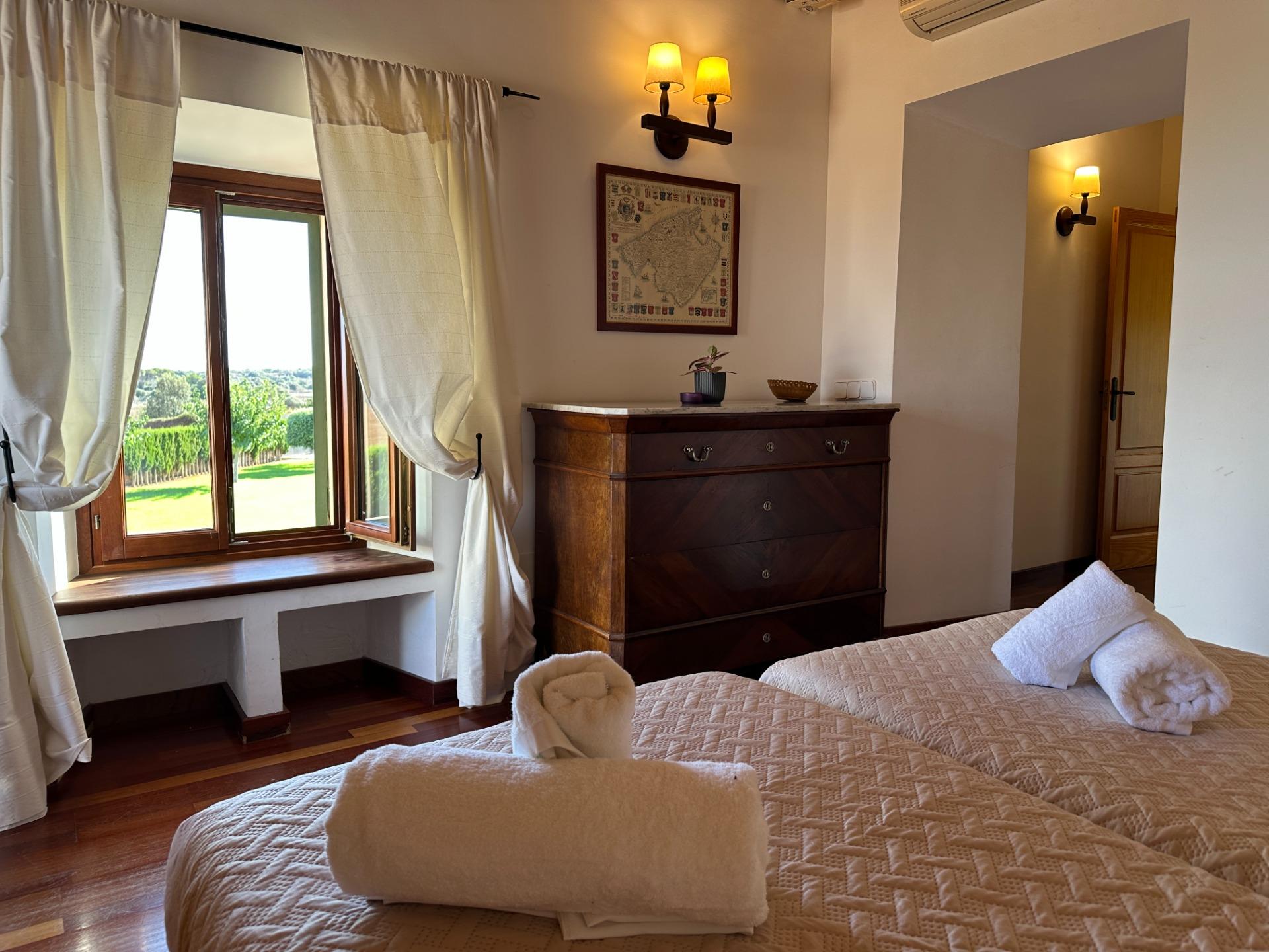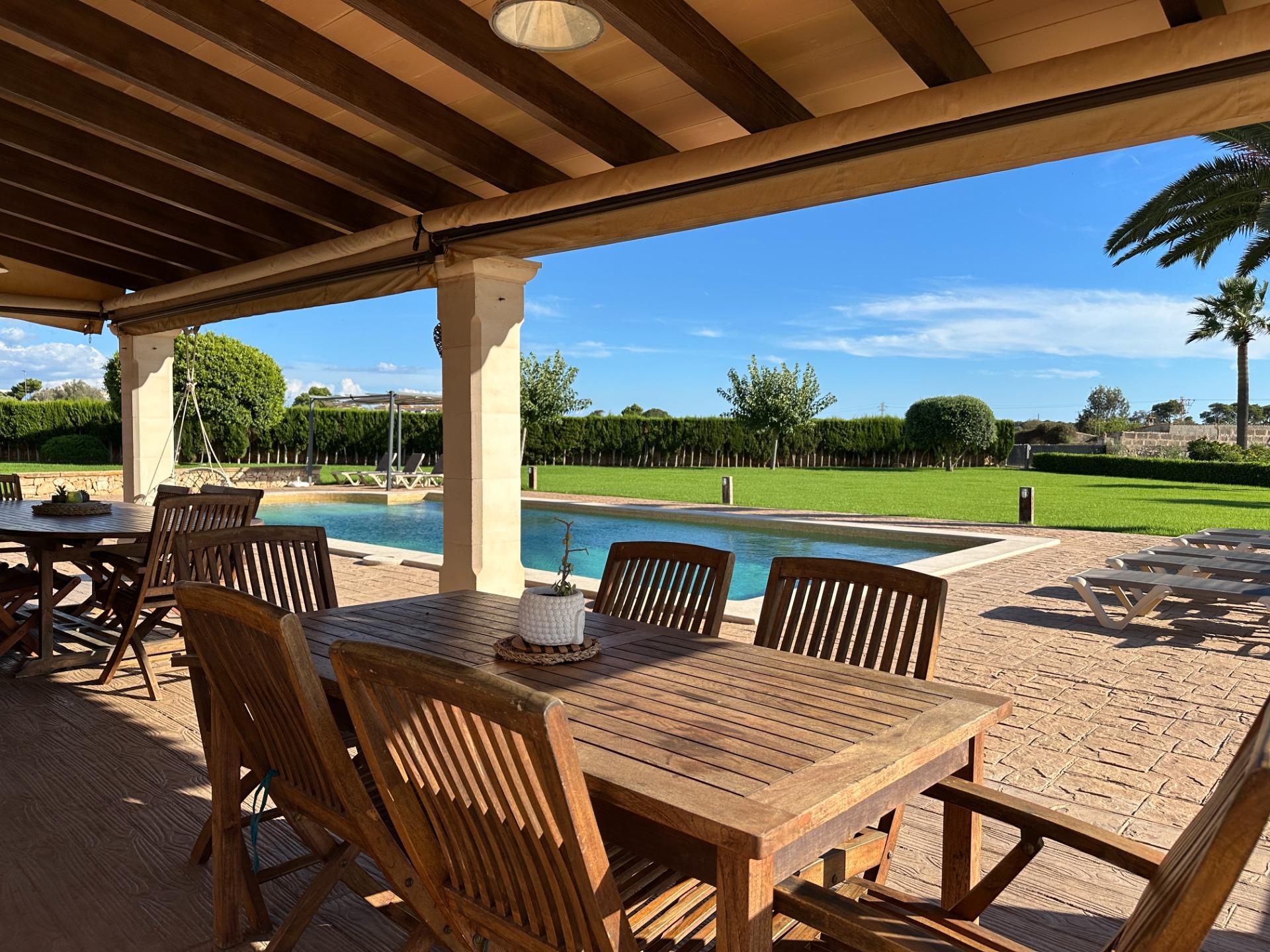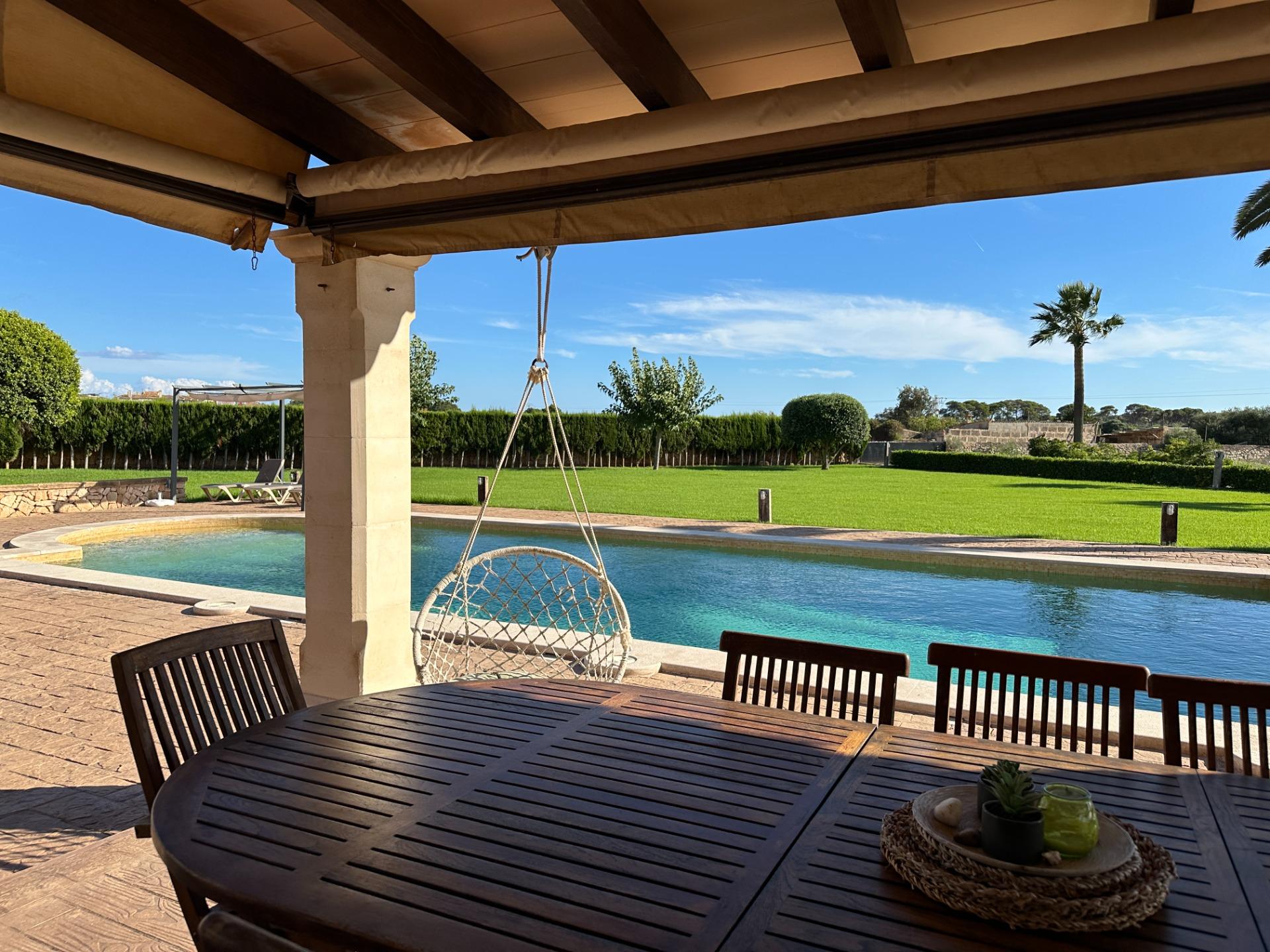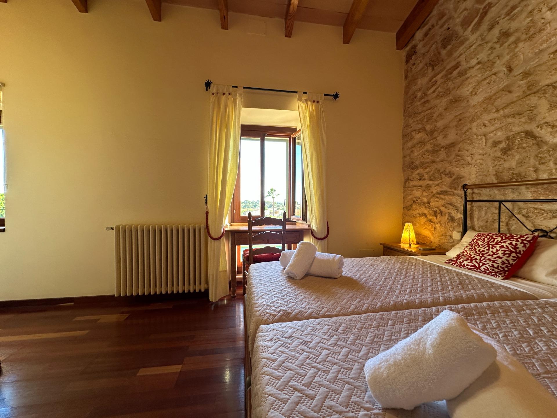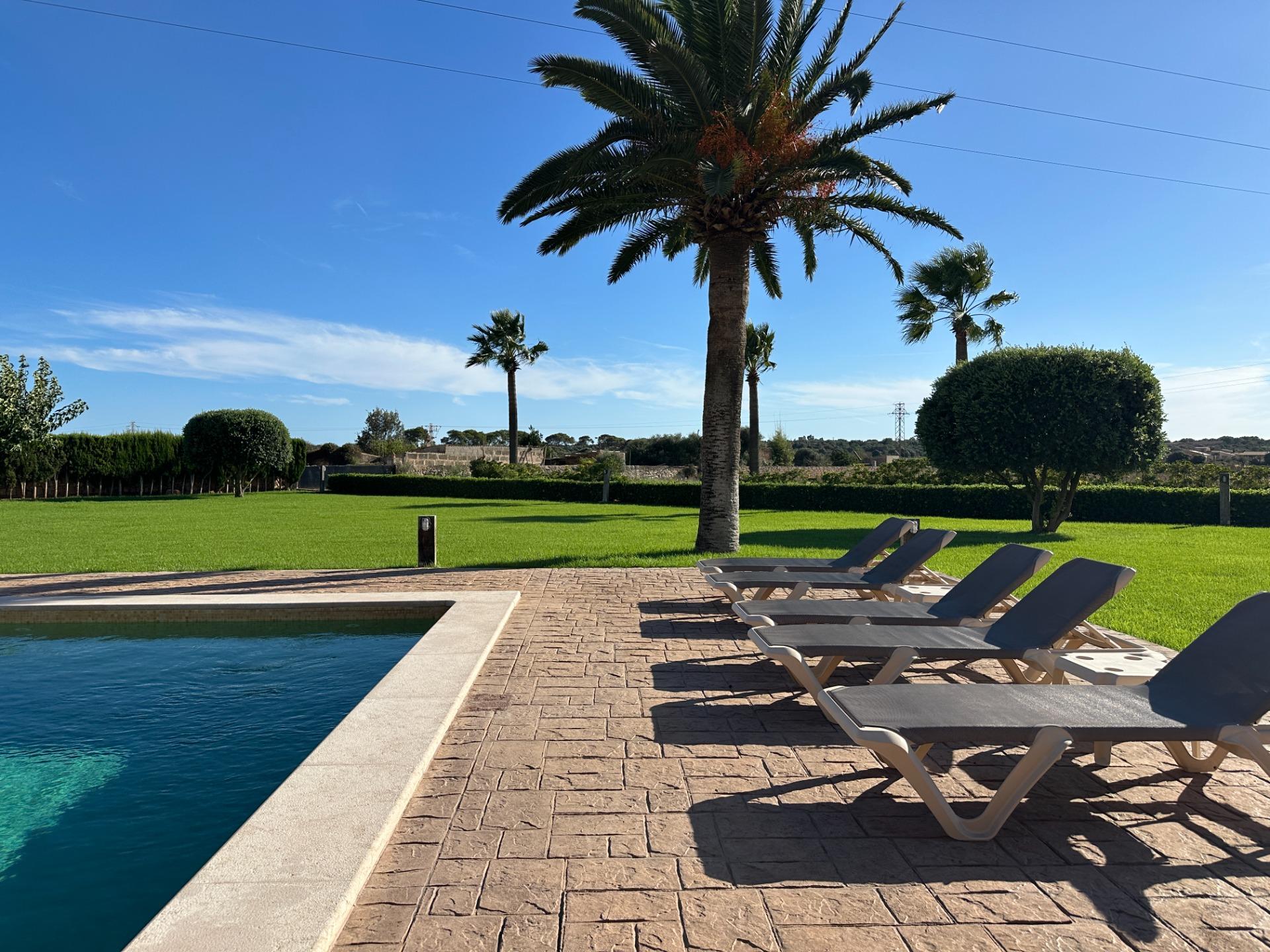 Casa de campo con carácter, de estilo mallorquín a 8 minutos caminando del centro de Santanyí con licencia de alquiler turístico de 8 plazas. Santanyí; en los últimos años, su popularidad y merecida fama han ido creciendo, convirtiéndose en uno de los pueblos más visitados de la isla. Famoso por sus 2 mercados semanales, su arquitectura tradicional y sus eventos culturales. Además cuenta con una línea de costa con unas playas paradisíacas de arena blanca y agua transparente.La casa es de arquitectura tradicional mallorquina, está situada en las afueras del pueblo en un terreno de 26.618 m2. Consta de una vivienda unifamiliar aislada con piscina, con una superficie en dos plantas de 517m2, piscina de 82 m2 de espejo de agua, 520 m2 de terrazas. Paredes interiores y exteriores de piedra. La cocina y el salón comedor se encuentran en la planta baja, dispone de 1 habitación doble con baño en la planta baja y tres habitaciones dobles, una con baño en suite y las otras dos con baño compartido ,en la primera planta. En la planta baja también tiene un baño extra para invitados.Porches 161 m2Zona jardín con 1.800 m2 de césped.Sala de máquinas subterránea 55 m2. Reformada íntegramente en el año 2.000, tiene una licencia para una ampliación de unos 150 m2.Conexión eléctrica. Pozo de agua dulce legalizado.1 aljibe de gran capacidad para riego jardín. 1 aljibe para almacenamiento agua hogar. Calefacción central (radiadores) Gasoil.Piscina por hidrolisis de sal.