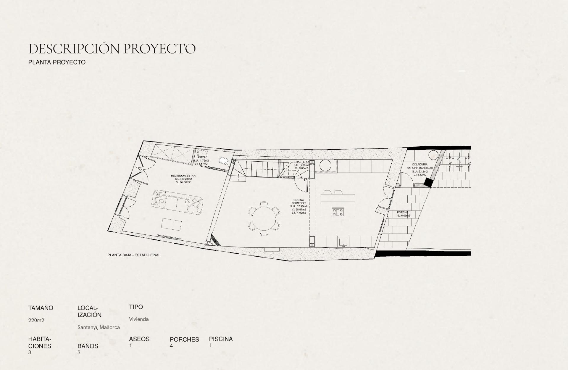 El objetivo del diseño es crear una casa en Santanyí que une la tradición mallorquina con un lenguaje contemporáneo. La esencia es “la piedra que respira”, buscando un equilibrio entre la memoria de la casa tradicional de pueblo y una lectura contemporánea, que ofrezca confort, frescura y autenticidad mediterránea.